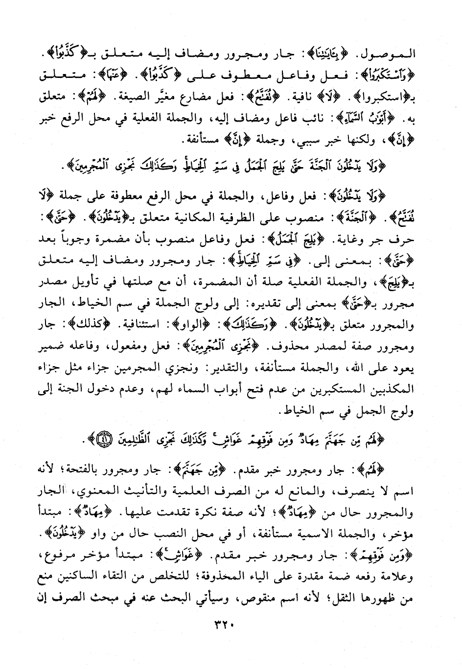 {وَلا يَدْخُلُونَ}: فعل وفاعل، والجملة في محل الرفع معطوفة على جملة {لا تُفَتَّحُ}. {الْجَنَّةَ}: منصوب على الظرفية المكانية متعلق بـ {يَدْخُلُونَ}. {حَتَّى}: حرف جر وغاية. {يَلِجَ الْجَمَلُ}: فعل وفاعل منصوب بأن مضمرة وجوبا بعد {حَتَّى}: بمعنى إلى. {فِي سَمِّ الْخِياطِ}: جار ومجرور ومضاف إليه متعلق بـ {يَلِجَ}، والجملة الفعلية صلة أن المضمرة، أن مع صلتها في تأويل مصدر مجرور بـ {حَتَّى} بمعنى إلى تقديره: إلى ولوج الجملة في سم الخياط، الجار والمجرور متعلق بـ {يَدْخُلُونَ}. {وَكَذلِكَ}: {الواو}: استئنافية. {كَذلِكَ}: جار ومجرور صفة لمصدر محذوف. {نَجْزِي الْمُجْرِمِينَ}: فعل ومفعول، وفاعله ضمير يعود على الله، والجملة مستأنفة، والتقدير: ونجزي المجرمين جزاء مثل جزاء المكذبين المستكبرين من عدم فتح أبواب السماء لهم، وعدم دخول الجنة إلى ولوج الجمل في سم الخياط.