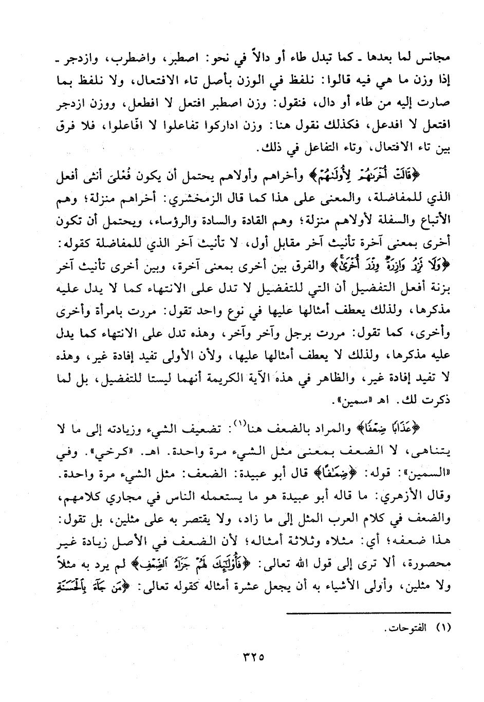 {عَذابًا ضِعْفًا} والمراد بالضعف هنا (¬1): تضعيف الشيء وزيادته إلى ما لا يتناهى، لا الضعف بمعنى مثل الشيء مرة واحدة. اه. «كرخي». وفي «السمين»: قوله: {ضِعْفًا} قال أبو عبيدة: الضعف: مثل الشيء مرة واحدة. وقال الأزهري: ما قاله أبو عبيدة هو ما يستعمله الناس في مجاري كلامهم، والضعف في كلام العرب المثل إلى ما زاد، ولا يقتصر به على مثلين، بل تقول: هذا ضعفه؛ أي: مثلاه وثلاثة أمثاله؛ لأن الضعف في الأصل زيادة غير محصورة، ألا ترى إلى قول الله تعالى: {فَأُولئِكَ لَهُمْ جَزاءُ الضِّعْفِ} لم يرد به مثلا ولا مثلين، وأولى الأشياء به أن يجعل عشرة أمثاله كقوله تعالى: {مَنْ جاءَ بِالْحَسَنَةِ