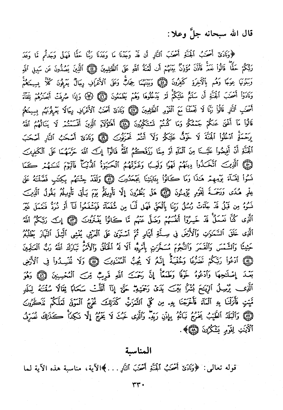 {وَنادى أَصْحابُ الْجَنَّةِ أَصْحابَ النَّارِ أَنْ قَدْ وَجَدْنا ما وَعَدَنا رَبُّنا حَقًّا فَهَلْ وَجَدْتُمْ ما وَعَدَ رَبُّكُمْ حَقًّا قالُوا نَعَمْ فَأَذَّنَ مُؤَذِّنٌ بَيْنَهُمْ أَنْ لَعْنَةُ اللَّهِ عَلَى الظَّالِمِينَ (44) الَّذِينَ يَصُدُّونَ عَنْ سَبِيلِ اللَّهِ وَيَبْغُونَها عِوَجًا وَهُمْ بِالْآخِرَةِ كافِرُونَ (45) وَبَيْنَهُما حِجابٌ وَعَلَى الْأَعْرافِ رِجالٌ يَعْرِفُونَ كُلاًّ بِسِيماهُمْ وَنادَوْا أَصْحابَ الْجَنَّةِ أَنْ سَلامٌ عَلَيْكُمْ لَمْ يَدْخُلُوها وَهُمْ يَطْمَعُونَ (46) وَإِذا صُرِفَتْ أَبْصارُهُمْ تِلْقاءَ أَصْحابِ النَّارِ قالُوا رَبَّنا لا تَجْعَلْنا مَعَ الْقَوْمِ الظَّالِمِينَ (47) وَنادى أَصْحابُ الْأَعْرافِ رِجالًا يَعْرِفُونَهُمْ بِسِيماهُمْ قالُوا ما أَغْنى عَنْكُمْ جَمْعُكُمْ وَما كُنْتُمْ تَسْتَكْبِرُونَ (48) أَهؤُلاءِ الَّذِينَ أَقْسَمْتُمْ لا يَنالُهُمُ اللَّهُ بِرَحْمَةٍ ادْخُلُوا الْجَنَّةَ لا خَوْفٌ عَلَيْكُمْ وَلا أَنْتُمْ تَحْزَنُونَ (49) وَنادى أَصْحابُ النَّارِ أَصْحابَ الْجَنَّةِ أَنْ أَفِيضُوا عَلَيْنا مِنَ الْماءِ أَوْ مِمَّا رَزَقَكُمُ اللَّهُ قالُوا إِنَّ اللَّهَ حَرَّمَهُما عَلَى الْكافِرِينَ (50) الَّذِينَ اتَّخَذُوا دِينَهُمْ لَهْوًا وَلَعِبًا وَغَرَّتْهُمُ الْحَياةُ الدُّنْيا فَالْيَوْمَ نَنْساهُمْ كَما نَسُوا لِقاءَ يَوْمِهِمْ هذا وَما كانُوا بِآياتِنا يَجْحَدُونَ (51) وَلَقَدْ جِئْناهُمْ بِكِتابٍ فَصَّلْناهُ عَلى عِلْمٍ هُدىً وَرَحْمَةً لِقَوْمٍ يُؤْمِنُونَ (52) هَلْ يَنْظُرُونَ إِلاَّ تَأْوِيلَهُ يَوْمَ يَأْتِي تَأْوِيلُهُ يَقُولُ الَّذِينَ نَسُوهُ مِنْ قَبْلُ قَدْ جاءَتْ رُسُلُ رَبِّنا بِالْحَقِّ فَهَلْ لَنا مِنْ شُفَعاءَ فَيَشْفَعُوا لَنا أَوْ نُرَدُّ فَنَعْمَلَ غَيْرَ الَّذِي كُنَّا نَعْمَلُ قَدْ خَسِرُوا أَنْفُسَهُمْ وَضَلَّ عَنْهُمْ ما كانُوا يَفْتَرُونَ (53) إِنَّ رَبَّكُمُ اللَّهُ الَّذِي خَلَقَ السَّماواتِ وَالْأَرْضَ فِي سِتَّةِ أَيَّامٍ ثُمَّ اسْتَوى عَلَى الْعَرْشِ يُغْشِي اللَّيْلَ النَّهارَ يَطْلُبُهُ حَثِيثًا وَالشَّمْسَ وَالْقَمَرَ وَالنُّجُومَ مُسَخَّراتٍ بِأَمْرِهِ أَلا لَهُ الْخَلْقُ وَالْأَمْرُ تَبارَكَ اللَّهُ رَبُّ الْعالَمِينَ (54) ادْعُوا رَبَّكُمْ تَضَرُّعًا وَخُفْيَةً إِنَّهُ لا يُحِبُّ الْمُعْتَدِينَ (55) وَلا تُفْسِدُوا فِي الْأَرْضِ بَعْدَ إِصْلاحِها وَادْعُوهُ خَوْفًا وَطَمَعًا إِنَّ رَحْمَتَ اللَّهِ قَرِيبٌ مِنَ الْمُحْسِنِينَ (56) وَهُوَ الَّذِي يُرْسِلُ الرِّياحَ بُشْرًا بَيْنَ يَدَيْ رَحْمَتِهِ حَتَّى إِذا أَقَلَّتْ سَحابًا ثِقالًا سُقْناهُ لِبَلَدٍ مَيِّتٍ فَأَنْزَلْنا بِهِ الْماءَ فَأَخْرَجْنا بِهِ مِنْ كُلِّ الثَّمَراتِ كَذلِكَ نُخْرِجُ الْمَوْتى لَعَلَّكُمْ تَذَكَّرُونَ (57) وَالْبَلَدُ الطَّيِّبُ يَخْرُجُ نَباتُهُ بِإِذْنِ رَبِّهِ وَالَّذِي خَبُثَ لا يَخْرُجُ إِلاَّ نَكِدًا كَذلِكَ نُصَرِّفُ الْآياتِ لِقَوْمٍ يَشْكُرُونَ (58)}.
