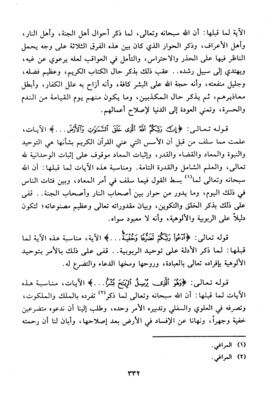 قوله تعالى: {إِنَّ رَبَّكُمُ اللَّهُ الَّذِي خَلَقَ السَّماواتِ وَالْأَرْضَ ...} الآيات، علمت مما سلف من قبل أن الأسس التي عني القرآن الكريم بشأنها هي التوحيد والنبوة والمعاد والقضاء والقدر، وإثبات المعاد موقوف على إثبات الوحدانية لله تعالى، والعلم الشامل والقدرة التامة. ومناسبة هذه الآيات لما قبلها: أن الله سبحانه وتعالى لما (¬1) بسط القول فيما سلف في أمر المعاد، وبين فئات الناس في ذلك اليوم، وما يدور من حوار بين أصحاب النار وأصحاب الجنة .. قفى على ذلك بذكر الخلق والتكوين، وبيان مقدوراته تعالى وعظيم مصنوعاته؛ لتكون دليلا على الربوبية والألوهية، وأنه لا معبود سواه.
