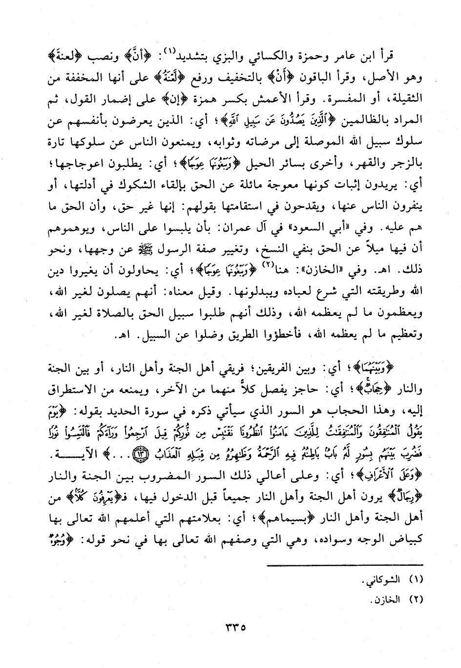 45 - ثم المراد بالظالمين {الَّذِينَ يَصُدُّونَ عَنْ سَبِيلِ اللَّهِ}؛ أي: الذين يعرضون بأنفسهم عن سلوك سبيل الله الموصلة إلى مرضاته وثوابه، ويمنعون الناس عن سلوكها تارة بالزجر والقهر، وأخرى بسائر الحيل {وَيَبْغُونَها عِوَجًا}؛ أي: يطلبون اعوجاجها؛ أي: يريدون إثبات كونها معوجة مائلة عن الحق بإلقاء الشكوك في أدلتها، أو ينفرون الناس عنها، ويقدحون في استقامتها بقولهم: إنها غير حق، وأن الحق ما هم عليه. وفي «أبي السعود» في آل عمران: بأن يلبسوا على الناس، ويوهموهم أن فيها ميلا عن الحق بنفي النسخ، وتغيير صفة الرسول صلى الله عليه وسلم عن وجهها، ونحو ذلك. اه. وفي «الخازن»: هنا (¬2) {وَيَبْغُونَها عِوَجًا}؛ أي: يحاولون أن يغيروا دين الله وطريقته التي شرع لعباده ويبدلونها. وقيل معناه: أنهم يصلون لغير الله، ويعظمون ما لم يعظمه الله، وذلك أنهم طلبوا سبيل الحق بالصلاة لغير الله، وتعظيم ما لم يعظمه الله، فأخطؤوا الطريق وضلوا عن السبيل. اه.