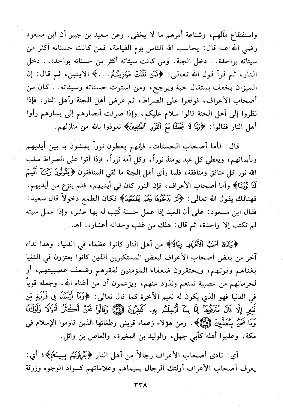 قال: فأما أصحاب الحسنات، فإنهم يعطون نورا يمشون به بين أيديهم وبأيمانهم، ويعطي كل عبد يومئذ نورا، وكل أمة نورا، فإذا أتوا على الصراط سلب الله نور كل منافق ومنافقة، فلما رأى أهل الجنة ما لقي المنافقون {يَقُولُونَ رَبَّنا أَتْمِمْ لَنا نُورَنا} وأما أصحاب الأعراف، فإن النور كان في أيديهم، فلم ينزع من أيديهم، فهنالك يقول الله تعالى: {لَمْ يَدْخُلُوها وَهُمْ يَطْمَعُونَ} فكان الطمع دخولا قال سعيد: فقال ابن مسعود: على أن العبد إذا عمل حسنة كتب له بها عشر، وإذا عمل سيئة لم تكتب إلا واحدة، ثم قال: هلك من غلب وحدانه أعشاره. اه.