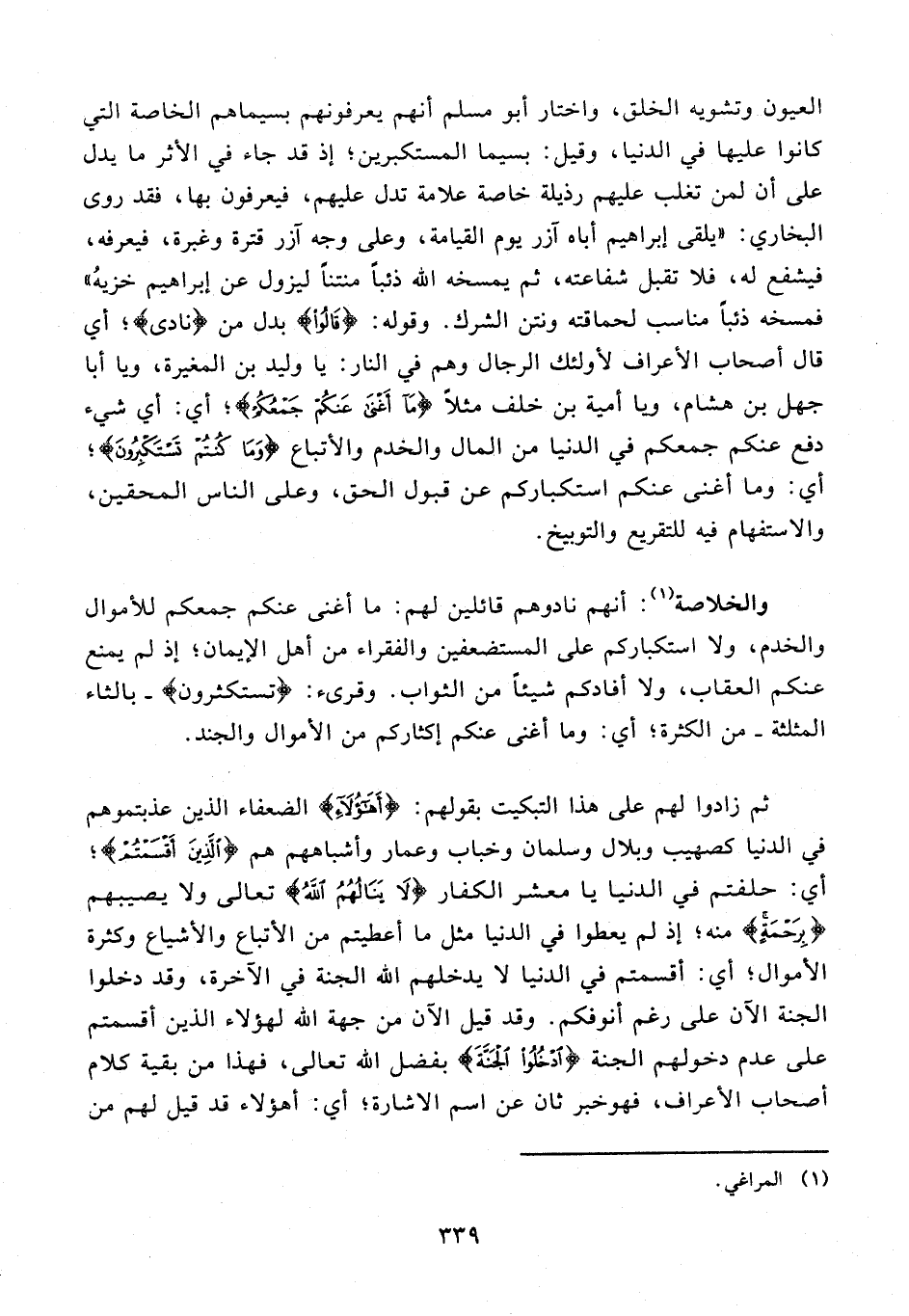 العيون وتشويه الخلق، واختار أبو مسلم أنهم يعرفونهم بسيماهم الخاصة التي كانوا عليها في الدنيا، وقيل: بسيما المستكبرين؛ إذ قد جاء في الأثر ما يدل على أن لمن تغلب عليهم رذيلة خاصة علامة تدل عليهم، فيعرفون بها، فقد روى البخاري: «يلقى إبراهيم أباه آزر يوم القيامة، وعلى وجه آزر قترة وغبرة، فيعرفه، فيشفع له، فلا تقبل شفاعته، ثم يمسخه الله ذئبا منتنا ليزول عن إبراهيم خزيه» فمسخه ذئبا مناسب لحماقته ونتن الشرك. وقوله: {قالُوا} بدل من {نادى}؛ أي قال أصحاب الأعراف لأولئك الرجال وهم في النار: يا وليد بن المغيرة، ويا أبا جهل بن هشام، ويا أمية بن خلف مثلا {ما أَغْنى عَنْكُمْ جَمْعُكُمْ}؛ أي: أي شيء دفع عنكم جمعكم في الدنيا من المال والخدم والأتباع {وَما كُنْتُمْ تَسْتَكْبِرُونَ}؛ أي: وما أغنى عنكم استكباركم عن قبول الحق، وعلى الناس المحقين، والاستفهام فيه للتقريع والتوبيخ.