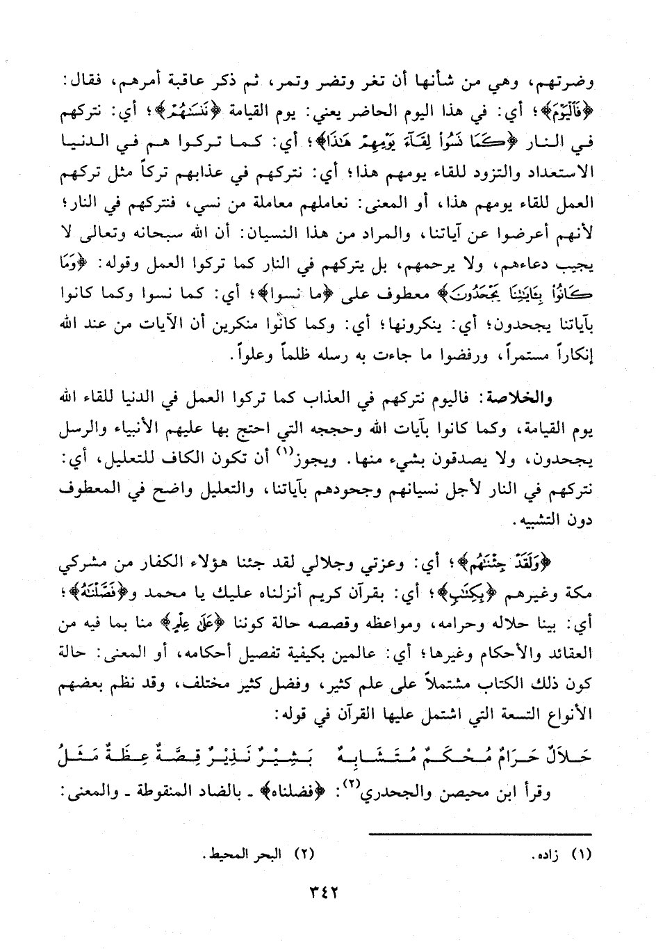 والخلاصة: فاليوم نتركهم في العذاب كما تركوا العمل في الدنيا للقاء الله يوم القيامة، وكما كانوا بآيات الله وحججه التي احتج بها عليهم الأنبياء والرسل يجحدون، ولا يصدقون بشيء منها. ويجوز (¬1) أن تكون الكاف للتعليل، أي: نتركهم في النار لأجل نسيانهم وجحودهم بآياتنا، والتعليل واضح في المعطوف دون التشبيه.