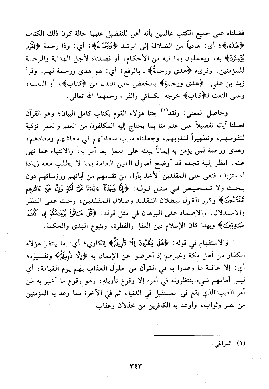وحاصل المعنى: ولقد (¬1) جئنا هؤلاء القوم بكتاب كامل البيان؛ وهو القرآن فصلنا آياته تفصيلا على علم منا بما يحتاج إليه المكلفون من العلم والعمل تزكية لنفوسهم، وتطهيرا لقلوبهم، وجعلناه سبب سعادتهم في معاشهم ومعادهم، وهدى ورحمة لمن يؤمن به إيمانا يبعثه على العمل بما أمر به، والانتهاء عما نهى عنه. انظر إليه تجده قد أوضح أصول الدين العامة بما لا يطلب معه زيادة لمستزيد، فنعى على المقلدين الأخذ بآراء من تقدمهم من آبائهم ورؤسائهم دون بحث ولا تمحيص في مثل قوله: {إِنَّا وَجَدْنا آباءَنا عَلى أُمَّةٍ وَإِنَّا عَلى آثارِهِمْ مُقْتَدُونَ} وكرر القول ببطلان التقليد وضلال المقلدين، وحث على النظر والاستدلال، والاعتماد على البرهان في مثل قوله: {قُلْ هاتُوا بُرْهانَكُمْ إِنْ كُنْتُمْ صادِقِينَ} وبهذا كان الإسلام دين العقل والفطرة، وينبوع الهدى والحكمة.