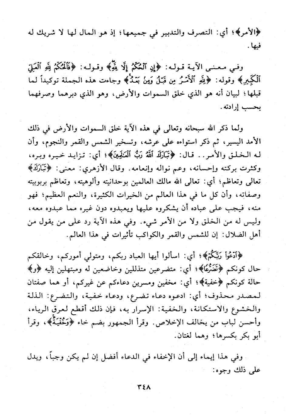 ولما ذكر الله سبحانه وتعالى في هذه الآية خلق السموات والأرض في ذلك الأمد اليسير، ثم ذكر استواءه على عرشه، وتسخير الشمس والقمر والنجوم، وأن له الخلق والأمر .. قال: {تَبارَكَ اللَّهُ رَبُّ الْعالَمِينَ}؛ أي: تزايد خيره وبره، وكثرت بركته وإحسانه، وعم نواله وإنعامه. وقال الأزهري: معنى: {تَبارَكَ} تعالى وتعاظم؛ أي: تعالى الله مالك العالمين بوحدانيته وألوهيته، وتعاظم بربوبيته وصفاته، وأن كل ما في هذا العالم من الخيرات الكثيرة، والنعم العظيم؛ فهو منه، فيجب على عباده أن يشكروه عليها ويعبدوه دون غيره مما عبدوه معه، وليس له من الخلق ولا من الأمر شيء. وفي هذه الآية رد على من يقول من أهل الضلال: إن للشمس والقمر والكواكب تأثيرات في هذا العالم.