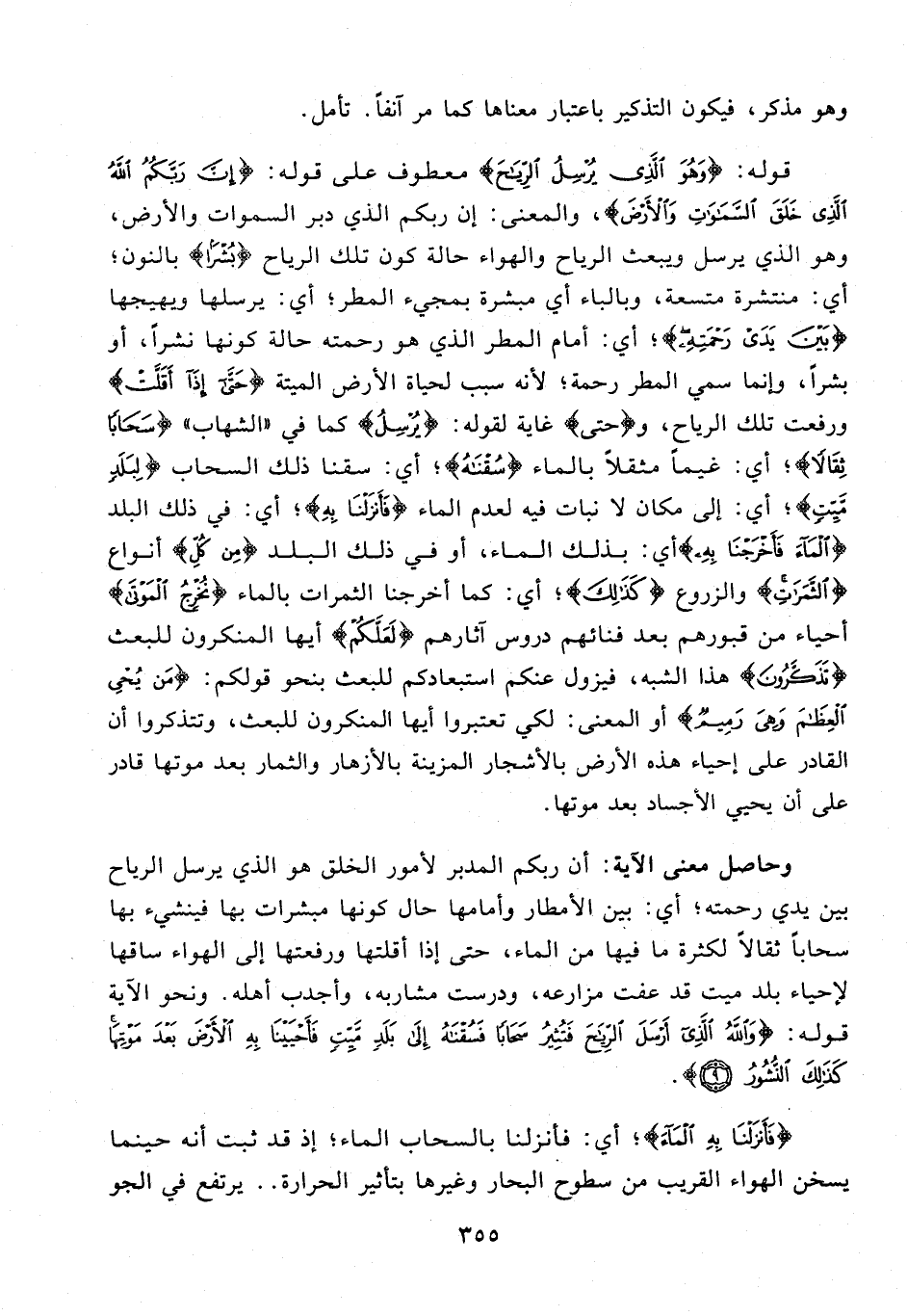 وحاصل معنى الآية: أن ربكم المدبر لأمور الخلق هو الذي يرسل الرياح بين يدي رحمته؛ أي: بين الأمطار وأمامها حال كونها مبشرات بها فينشيء بها سحابا ثقالا لكثرة ما فيها من الماء، حتى إذا أقلتها ورفعتها إلى الهواء ساقها لإحياء بلد ميت قد عفت مزارعه، ودرست مشاربه، وأجدب أهله. ونحو الآية قوله: {وَاللَّهُ الَّذِي أَرْسَلَ الرِّياحَ فَتُثِيرُ سَحابًا فَسُقْناهُ إِلى بَلَدٍ مَيِّتٍ فَأَحْيَيْنا بِهِ الْأَرْضَ بَعْدَ مَوْتِها كَذلِكَ النُّشُورُ (9)}.