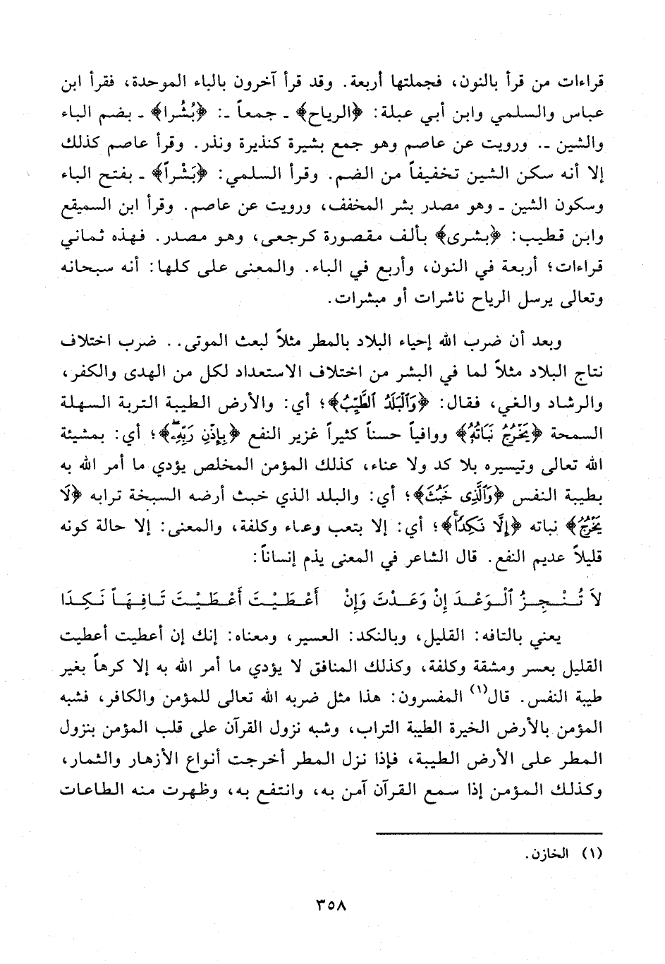قراءات من قرأ بالنون، فجملتها أربعة. وقد قرأ آخرون بالباء الموحدة، فقرأ ابن عباس والسلمي وابن أبي عبلة: {الرِّياحَ} - جمعا -: {بُشُرا} - بضم الباء والشين -. ورويت عن عاصم وهو جمع بشيرة كنذيرة ونذر. وقرأ عاصم كذلك إلا أنه سكن الشين تخفيفا من الضم. وقرأ السلمي: {بَشْرا} - بفتح الباء وسكون الشين - وهو مصدر بشر المخفف، ورويت عن عاصم. وقرأ ابن السميقع وابن قطيب: {بشرى} بألف مقصورة كرجعى، وهو مصدر. فهذه ثماني قراءات؛ أربعة في النون، وأربع في الباء. والمعنى على كلها: أنه سبحانه وتعالى يرسل الرياح ناشرات أو مبشرات.