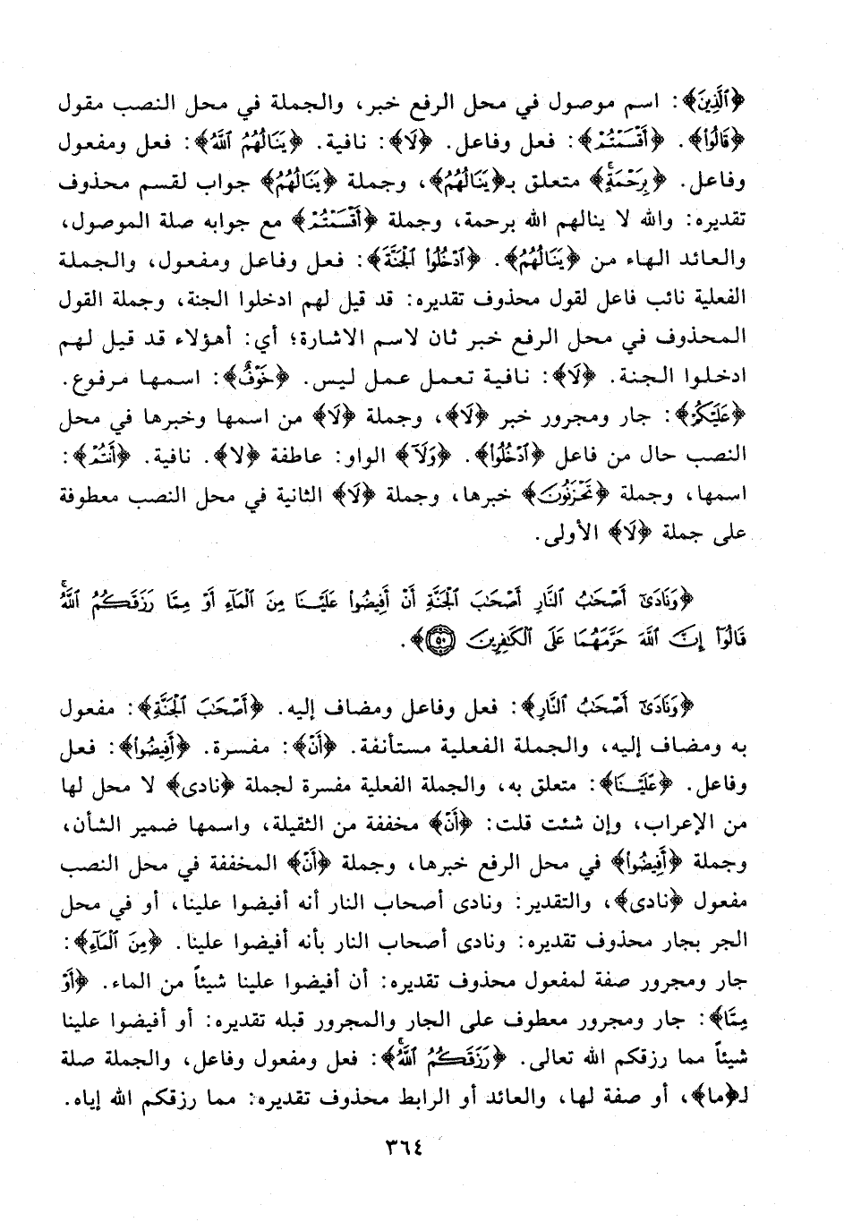 {وَنادى أَصْحابُ النَّارِ}: فعل وفاعل ومضاف إليه. {أَصْحابَ الْجَنَّةِ}: مفعول به ومضاف إليه، والجملة الفعلية مستأنفة. {أَنْ}: مفسرة. {أَفِيضُوا}: فعل وفاعل. {عَلَيْنا}: متعلق به، والجملة الفعلية مفسرة لجملة نادى لا محل لها من الإعراب، وإن شئت قلت: {أَنْ} مخففة من الثقيلة، واسمها ضمير الشأن، وجملة {أَفِيضُوا} في محل الرفع خبرها، وجملة {أَنْ} المخففة في محل النصب مفعول {نادى}، والتقدير: ونادى أصحاب النار أنه أفيضوا علينا، أو في محل الجر بجار محذوف تقديره: ونادى أصحاب النار بأنه أفيضوا علينا. {مِنَ الْماءِ}: جار ومجرور صفة لمفعول محذوف تقديره: أن أفيضوا علينا شيئا من الماء. {أَوْ مِمَّا}: جار ومجرور معطوف على الجار والمجرور قبله تقديره: أو أفيضوا علينا شيئا مما رزقكم الله تعالى. {رَزَقَكُمُ اللَّهُ}: فعل ومفعول وفاعل، والجملة صلة لـ {ما}، أو صفة لها، والعائد أو الرابط محذوف تقديره: مما رزقكم الله إياه.