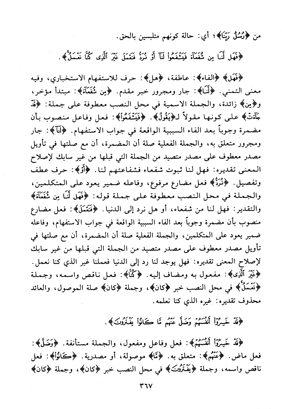 {فَهَلْ} {الفاء}: عاطفة، {هل}: حرف للاستفهام الاستخباري، وفيه معنى التمني. {لَنا}: جار ومجرور خبر مقدم. {مِنْ شُفَعاءَ}: مبتدأ مؤخر، و {مِنْ} زائدة، والجملة الاسمية في محل النصب معطوفة على جملة: {قَدْ جاءَتْ} على كونها مقولا لـ {يَقُولُ}. {فَيَشْفَعُوا}: فعل وفاعل منصوب بأن مضمرة وجوبا بعد الفاء السببية الواقعة في جواب الاستفهام. {لَنا}: جار ومجرور متعلق به، والجملة الفعلية صلة أن المضمرة، أن مع صلتها في تأويل مصدر معطوف على مصدر متصيد من الجملة التي قبلها من غير سابك لإصلاح المعنى تقديره: فهل لنا ثبوت شفعاء فشفاعتهم لنا. {أَوْ}: حرف عطف وتفصيل. {نُرَدُّ} فعل مضارع مرفوع، وفاعله ضمير يعود على المتكلمين، والجملة في محل النصب معطوفة على جملة قوله: {فَهَلْ لَنا مِنْ شُفَعاءَ} والتقدير: فهل لنا من شفعاء، أو هل نرد إلى الدنيا. {فَنَعْمَلَ}: فعل مضارع منصوب بأن مضمرة وجوبا بعد الفاء السببية الواقعة في جواب الاستفهام، وفاعله ضمير يعود على المتكلمين، والجملة الفعلية صلة أن المضمرة، أن مع صلتها في تأويل مصدر معطوف على مصدر متصيد من الجملة التي قبلها من غير سابك لإصلاح المعنى تقديره: فهل يوجد لنا رد إلى الدنيا فعملنا غير الذي كنا نعمل. {غَيْرَ الَّذِي}: مفعول به ومضاف إليه. {كُنَّا}: فعل ناقص واسمه، وجملة {نَعْمَلُ} في محل النصب خبر {كان}، وجملة {كان} صلة الموصول، والعائد محذوف تقديره: غيره الذي كنا نعلمه.