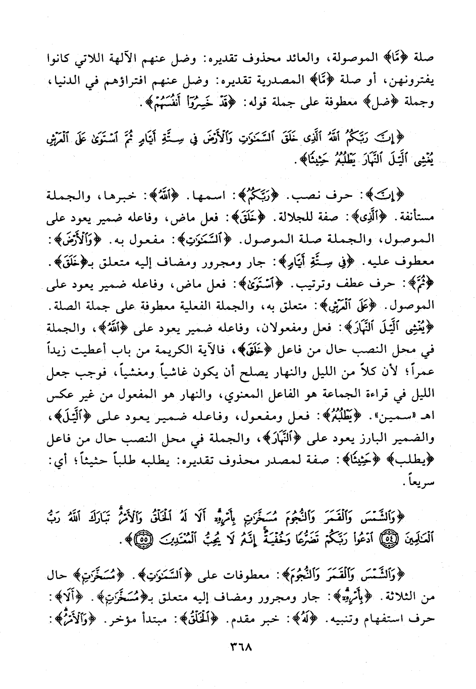 {إِنَّ}: حرف نصب. {رَبَّكُمُ}: اسمها. {اللَّهُ}: خبرها، والجملة مستأنفة. {الَّذِي}: صفة للجلالة. {خَلَقَ}: فعل ماض، وفاعله ضمير يعود على الموصول، والجملة صلة الموصول. {السَّماواتِ}: مفعول به. {وَالْأَرْضَ}: معطوف عليه. {فِي سِتَّةِ أَيَّامٍ}: جار ومجرور ومضاف إليه متعلق بـ {خَلَقَ}. {ثُمَّ}: حرف عطف وترتيب. {اسْتَوى}: فعل ماض، وفاعله ضمير يعود على الموصول. {عَلَى الْعَرْشِ}: متعلق به، والجملة الفعلية معطوفة على جملة الصلة. {يُغْشِي اللَّيْلَ النَّهارَ}: فعل ومفعولان، وفاعله ضمير يعود على {اللَّهُ}، والجملة في محل النصب حال من فاعل {خَلَقَ}، فالآية الكريمة من باب أعطيت زيدا عمرا؛ لأن كلا من الليل والنهار يصلح أن يكون غاشيا ومغشيا، فوجب جعل الليل في قراءة الجماعة هو الفاعل المعنوي، والنهار هو المفعول من غير عكس اه «سمين». {يَطْلُبُهُ}: فعل ومفعول، وفاعله ضمير يعود على {اللَّيْلَ}، والضمير البارز يعود على {النَّهارَ}، والجملة في محل النصب حال من فاعل {يطلب} {حَثِيثًا}: صفة لمصدر محذوف تقديره: يطلبه طلبا حثيثا؛ أي: سريعا.