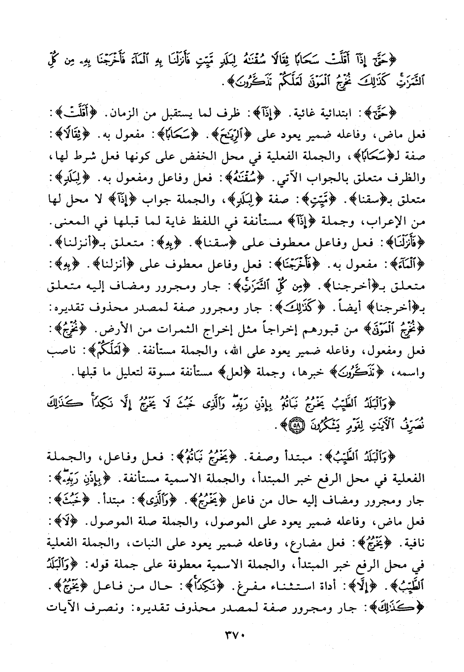 {حَتَّى}: ابتدائية غائية. {إِذا}: ظرف لما يستقبل من الزمان. {أَقَلَّتْ}: فعل ماض، وفاعله ضمير يعود على {الرِّياحَ}. {سَحابًا}: مفعول به. {ثِقالًا}: صفة لـ {سَحابًا}، والجملة الفعلية في محل الخفض على كونها فعل شرط لها، والظرف متعلق بالجواب الآتي. {سُقْناهُ}: فعل وفاعل ومفعول به. {لِبَلَدٍ}: متعلق بـ {سقنا}. {مَيِّتٍ}: صفة {لِبَلَدٍ}، والجملة جواب إِذا لا محل لها من الإعراب، وجملة {إِذا} مستأنفة في اللفظ غاية لما قبلها في المعنى. {فَأَنْزَلْنا}: فعل وفاعل معطوف على {سقنا}. {بِهِ}: متعلق بـ {أنزلنا}. {الْماءَ}: مفعول به. {فَأَخْرَجْنا}: فعل وفاعل معطوف على {أنزلنا}. بِهِ: متعلق بـ {أخرجنا}. {مِنْ كُلِّ الثَّمَراتِ}: جار ومجرور ومضاف إليه متعلق بـ {أخرجنا} أيضا. {كَذلِكَ}: جار ومجرور صفة لمصدر محذوف تقديره: {نُخْرِجُ الْمَوْتى} من قبورهم إخراجا مثل إخراج الثمرات من الأرض. {نُخْرِجُ}: فعل ومفعول، وفاعله ضمير يعود على الله، والجملة مستأنفة. {لَعَلَّكُمْ}: ناصب واسمه، {تَذَكَّرُونَ} خبرها، وجملة {لعل} مستأنفة مسوقة لتعليل ما قبلها.