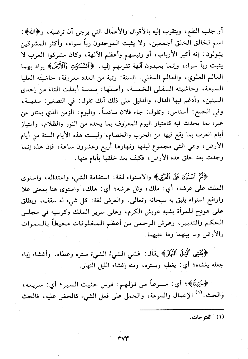 أو جلب النفع، ويتقرب إليه بالأقوال والأعمال التي يرجى أن ترضيه، و {اللَّهُ}: اسم لخالق الخلق أجمعين، ولا يثبت الموحدون ربا سواه، وأكثر المشركين يقولون: إنه أكبر الأرباب، أو رئيسهم وأعظم الآلهة، وكان مشركوا العرب لا يثبت ربا سواه، وإنما يعبدون آلهة تقربهم إليه. {السَّماواتِ وَالْأَرْضَ} يراد بهما العالم العلوي، والعالم السفلي. الستة: رتبة من العدد معروفة، حاشيته العليا السبعة، وحاشيته السفلى الخمسة، وأصلها: سدسة أبدلت التاء من إحدى السينين، وأدغم فيها الدال، والدليل على ذلك أنك تقول: في التصغير: سديسة، وفي الجمع: أسداس، وتقول: جاء فلان سادسا. واليوم: الزمن الذي يمتاز عن غيره بما يحدث فيه كامتياز اليوم المعروف بما يحده من النور والظلام، وامتياز أيام العرب بما يقع فيها من الحرب والخصام، وليست هذه الأيام الستة من أيام الأرض، وهي التي مجموع ليلها ونهارها أربع وعشرون ساعة، فإن هذه إنما وجدت بعد خلق هذه الأرض، فكيف يعد خلقها بأيام منها.