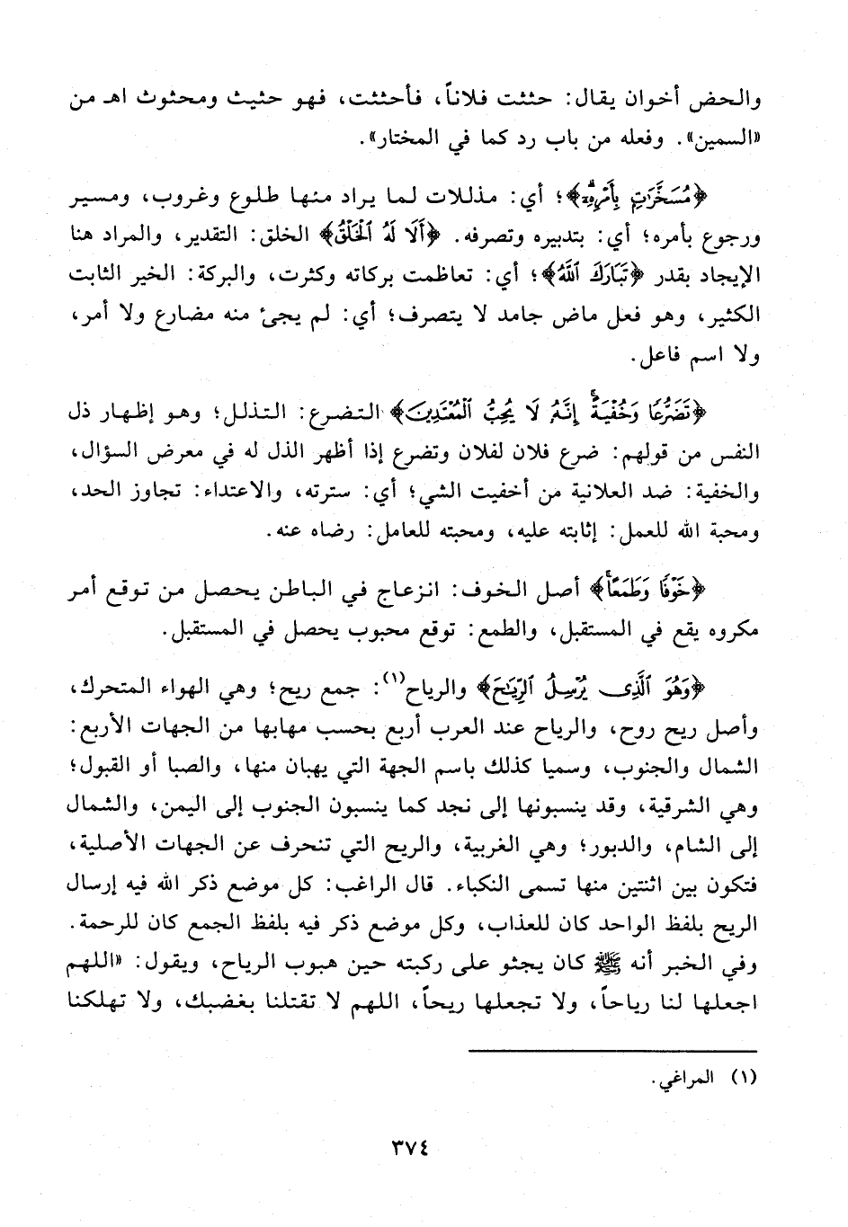 {وَهُوَ الَّذِي يُرْسِلُ الرِّياحَ} والرياح (¬1): جمع ريح؛ وهي الهواء المتحرك، وأصل ريح روح، والرياح عند العرب أربع بحسب مهابها من الجهات الأربع: الشمال والجنوب، وسميا كذلك باسم الجهة التي يهبان منها، والصبا أو القبول؛ وهي الشرقية، وقد ينسبونها إلى نجد كما ينسبون الجنوب إلى اليمن، والشمال إلى الشام، والدبور؛ وهي الغربية، والريح التي تنحرف عن الجهات الأصلية، فتكون بين اثنتين منها تسمى النكباء. قال الراغب: كل موضع ذكر الله فيه إرسال الريح بلفظ الواحد كان للعذاب، وكل موضع ذكر فيه بلفظ الجمع كان للرحمة. وفي الخبر أنه صلى الله عليه وسلم كان يجثو على ركبته حين هبوب الرياح، ويقول: «اللهم اجعلها لنا رياحا، ولا تجعلها ريحا، اللهم لا تقتلنا بغضبك، ولا تهلكنا