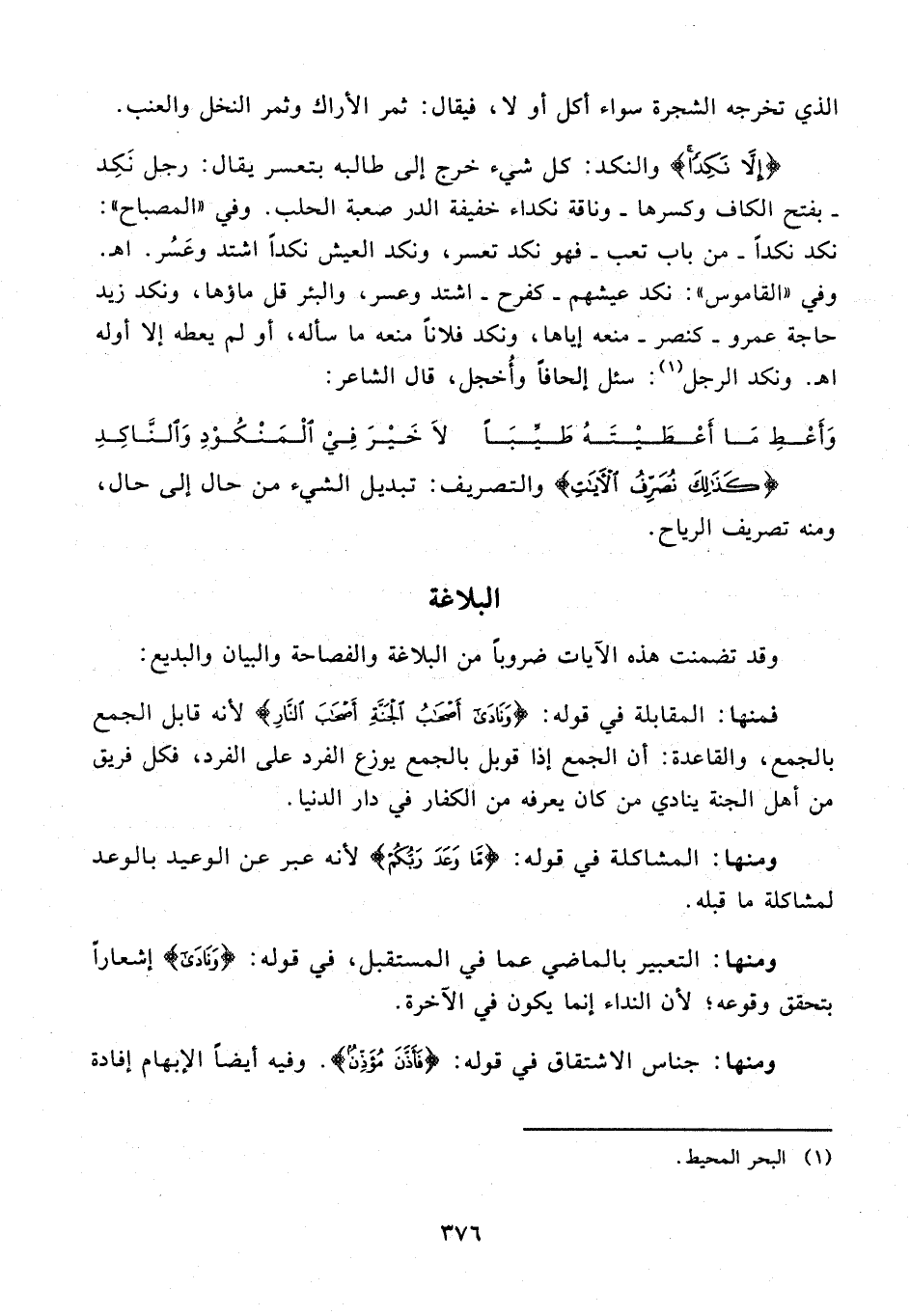 {إِلَّا نَكِدًا} والنكد: كل شيء خرج إلى طالبه بتعسر يقال: رجل نكد - بفتح الكاف وكسرها - وناقة نكداء خفيفة الدر صعبة الحلب. وفي «المصباح»: نكد نكدا - من باب تعب - فهو نكد تعسر، ونكد العيش نكدا اشتد وعسر. اه. وفي «القاموس»: نكد عيشهم - كفرح - اشتد وعسر، والبئر قل ماؤها، ونكد زيد حاجة عمرو - كنصر - منعه إياها، ونكد فلانا منعه ما سأله، أو لم يعطه إلا أوله اه. ونكد الرجل (¬1): سئل إلحافا وأخجل، قال الشاعر: