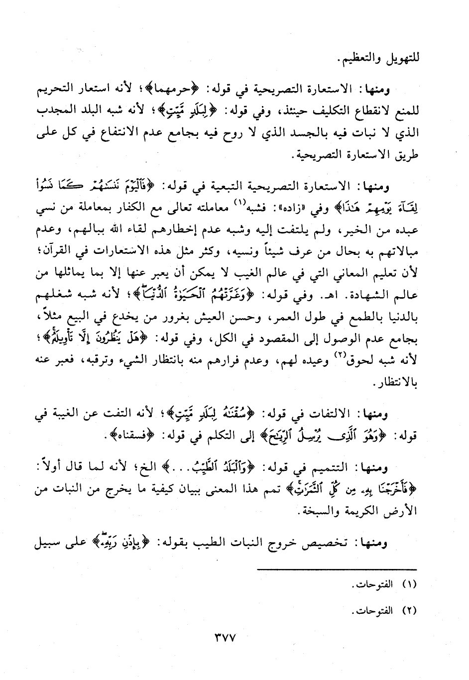 ومنها: الاستعارة التصريحية في قوله: {حَرَّمَهُما}؛ لأنه استعار التحريم للمنع لانقطاع التكليف حينئذ، وفي قوله: {لِبَلَدٍ مَيِّتٍ}؛ لأنه شبه البلد المجدب الذي لا نبات فيه بالجسد الذي لا روح فيه بجامع عدم الانتفاع في كل على طريق الاستعارة التصريحية.