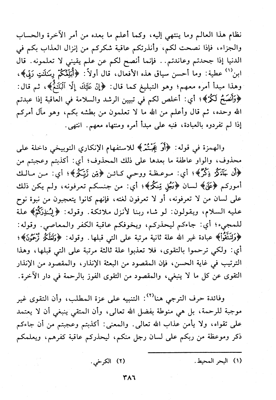 وفائدة حرف الترجي هنا (¬2): التنبيه على عزة المطلب، وأن التقوى غير موجبة للرحمة، بل هي منوطة بفضل الله تعالى، وأن المتقي ينبغي أن لا يعتمد على تقواه، ولا يأمن عذاب الله تعالى. والمعنى: أكذبتم وعجبتم من أن جاءكم ذكر وموعظة من ربكم على لسان رجل منكم، ليحذركم عاقبة كفرهم، ويعلمكم