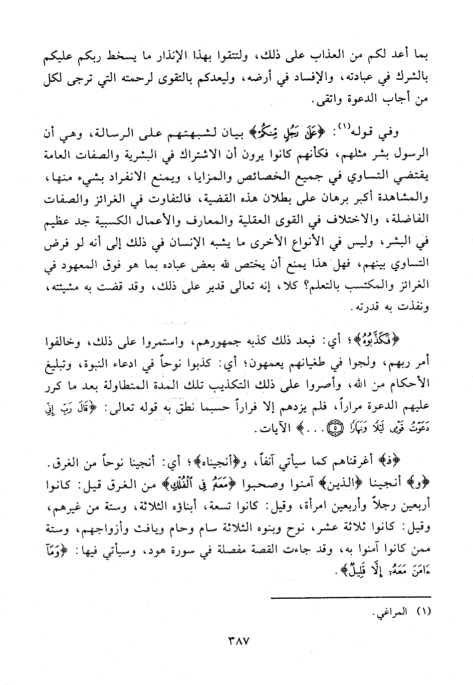 وفي قوله (¬1): {عَلى رَجُلٍ مِنْكُمْ} بيان لشبهتهم على الرسالة، وهي أن الرسول بشر مثلهم، فكأنهم كانوا يرون أن الاشتراك في البشرية والصفات العامة يقتضي التساوي في جميع الخصائص والمزايا، ويمنع الانفراد بشيء منها، والمشاهدة أكبر برهان على بطلان هذه القضية، فالتفاوت في الغرائز والصفات الفاضلة، والاختلاف في القوى العقلية والمعارف والأعمال الكسبية جد عظيم في البشر، وليس في الأنواع الأخرى ما يشبه الإنسان في ذلك إلى أنه لو فرض التساوي بينهم، فهل هذا يمنع أن يختص لله بعض عباده بما هو فوق المعهود في الغرائز والمكتسب بالتعلم؟ كلا، إنه تعالى قدير على ذلك، وقد قضت به مشيئته، ونفذت به قدرته.