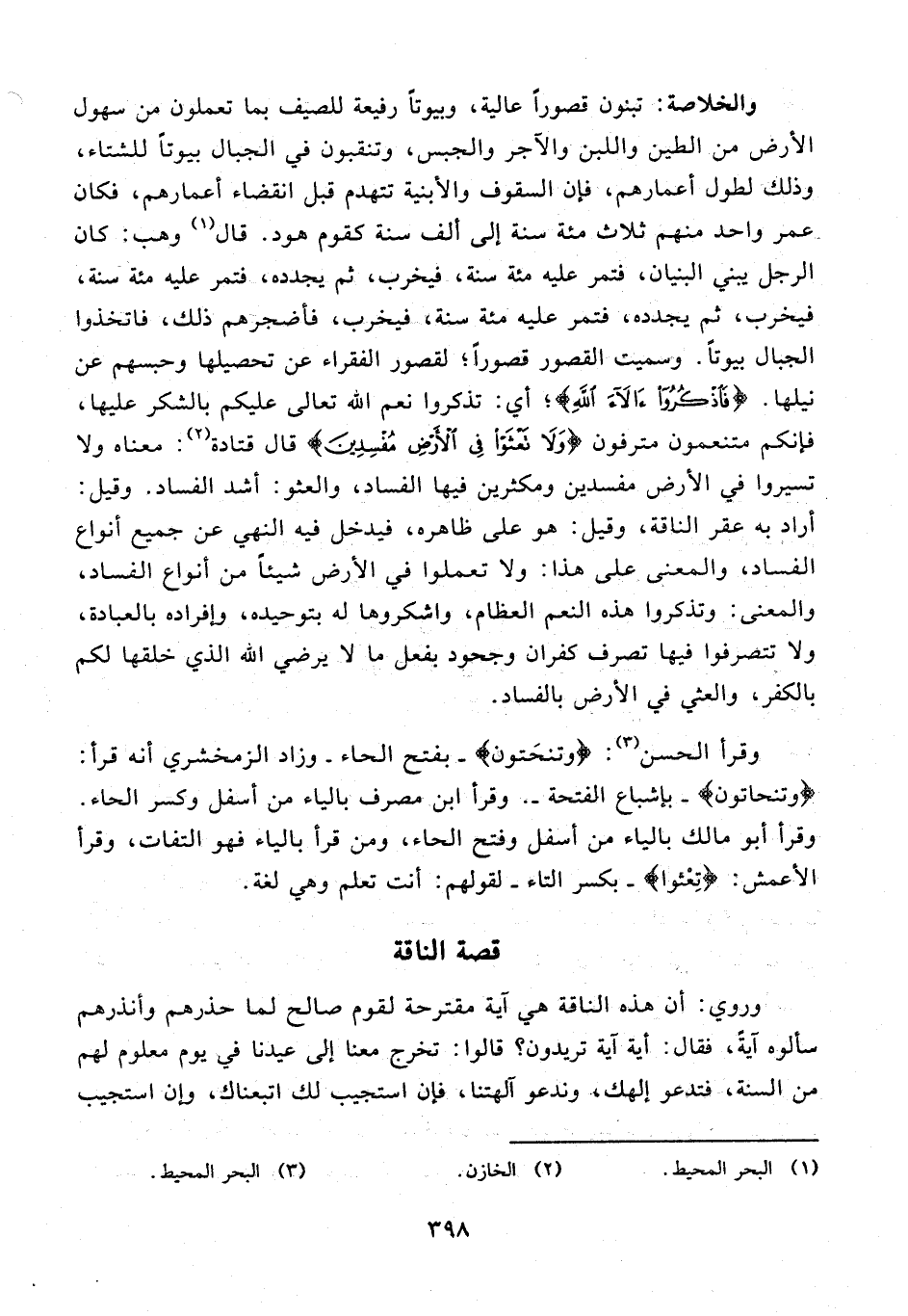 والخلاصة: تبنون قصورا عالية، وبيوتا رفيعة للصيف بما تعملون من سهول الأرض من الطين واللبن والآجر والجبس، وتنقبون في الجبال بيوتا للشتاء، وذلك لطول أعمارهم، فإن السقوف والأبنية تتهدم قبل انقضاء أعمارهم، فكان عمر واحد منهم ثلاث مئة سنة إلى ألف سنة كقوم هود. قال (¬1) وهب: كان الرجل يبني البنيان، فتمر عليه مئة سنة، فيخرب، ثم يجدده، فتمر عليه مئة سنة، فيخرب، ثم يجدده، فتمر عليه مئة سنة، فيخرب، فأضجرهم ذلك، فاتخذوا الجبال بيوتا. وسميت القصور قصورا؛ لقصور الفقراء عن تحصيلها وحبسهم عن نيلها. {فَاذْكُرُوا آلاءَ اللَّهِ}؛ أي: تذكروا نعم الله تعالى عليكم بالشكر عليها، فإنكم متنعمون مترفون {وَلا تَعْثَوْا فِي الْأَرْضِ مُفْسِدِينَ} قال قتادة (¬2): معناه ولا تسيروا في الأرض مفسدين ومكثرين فيها الفساد، والعثو: أشد الفساد. وقيل: