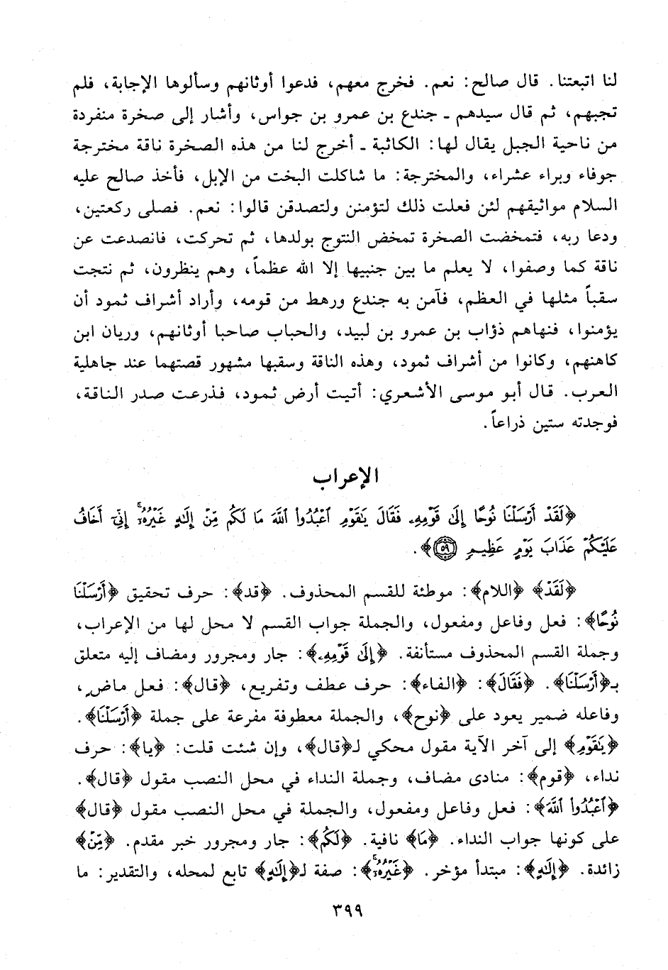 {لَقَدْ} {اللام}: موطئة للقسم المحذوف. {قد}: حرف تحقيق {أَرْسَلْنا نُوحًا}: فعل وفاعل ومفعول، والجملة جواب القسم لا محل لها من الإعراب، وجملة القسم المحذوف مستأنفة. {إِلى قَوْمِهِ}: جار ومجرور ومضاف إليه متعلق بـ {أَرْسَلْنا}. فَقالَ: {الفاء}: حرف عطف وتفريع، {قال}: فعل ماض، وفاعله ضمير يعود على {نوح}، والجملة معطوفة مفرعة على جملة {أَرْسَلْنا}. {يا قَوْمِ} إلى آخر الآية مقول محكي لـ {قال}، وإن شئت قلت: {يا}: حرف نداء، {قَوْمِ}: منادى مضاف، وجملة النداء في محل النصب مقول {قال}. {اعْبُدُوا اللَّهَ}: فعل وفاعل ومفعول، والجملة في محل النصب مقول {قال} على كونها جواب النداء. {ما} نافية. {لَكُمْ}: جار ومجرور خبر مقدم. {مِنْ} زائدة. {يَشْكُرُونَ}: مبتدأ مؤخر. {إِلهٍ}: صفة لـ {إِلهٍ} تابع لمحله، والتقدير: ما