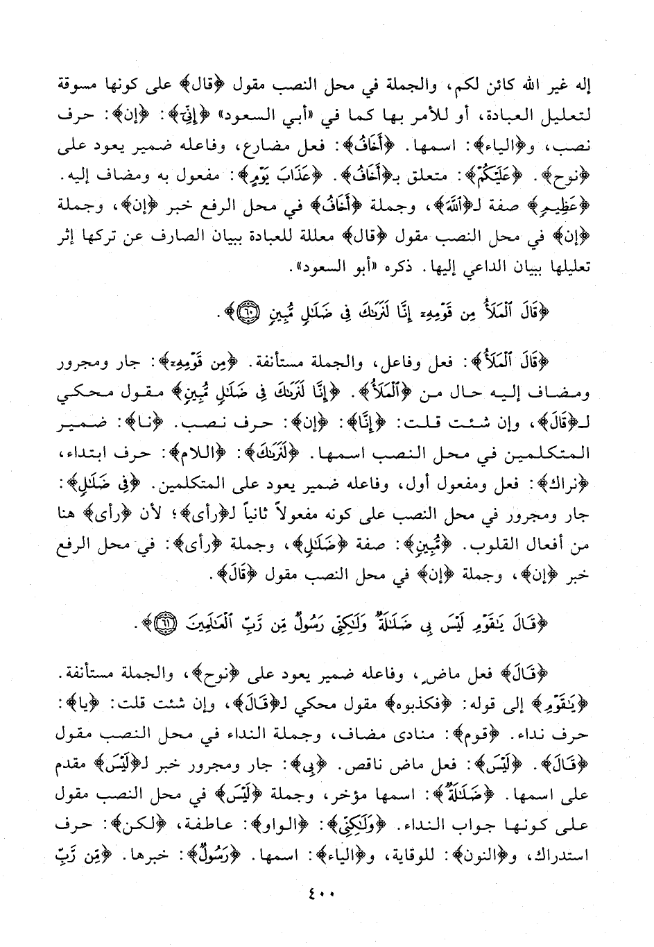 {قالَ} فعل ماض، وفاعله ضمير يعود على {نوح}، والجملة مستأنفة. {يا قَوْمِ} إلى قوله: {فَكَذَّبُوهُ} مقول محكي لـ {قالَ}، وإن شئت قلت: {يا}: حرف نداء. {قَوْمِ}: منادى مضاف، وجملة النداء في محل النصب مقول {قالَ}. {لَيْسَ}: فعل ماض ناقص. {بِي}: جار ومجرور خبر لـ {لَيْسَ} مقدم على اسمها. {ضَلالَةٌ}: اسمها مؤخر، وجملة {لَيْسَ} في محل النصب مقول على كونها جواب النداء. {وَلكِنِّي}: {الواو}: عاطفة، {لكن}: حرف استدراك، و {النون}: للوقاية، و {الياء}: اسمها. {رَسُولٌ}: خبرها. {مِنْ رَبِ