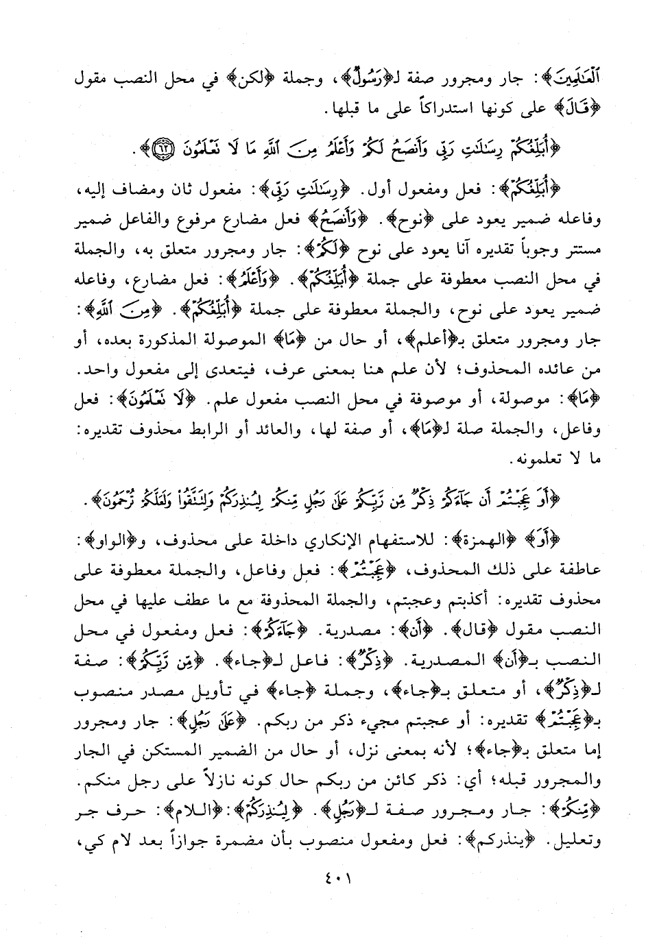 {أُبَلِّغُكُمْ}: فعل ومفعول أول. {رِسالاتِ رَبِّي}: مفعول ثان ومضاف إليه، وفاعله ضمير يعود على {نوح}. {وَأَنْصَحُ} فعل مضارع مرفوع والفاعل ضمير مستتر وجوبا تقديره آنا يعود على نوح {لَكُمْ}: جار ومجرور متعلق به، والجملة في محل النصب معطوفة على جملة {أُبَلِّغُكُمْ}. {وَأَعْلَمُ}: فعل مضارع، وفاعله ضمير يعود على نوح، والجملة معطوفة على جملة {أُبَلِّغُكُمْ}. {مِنَ اللَّهِ}: جار ومجرور متعلق بـ {أَعْلَمُ}، أو حال من {ما} الموصولة المذكورة بعده، أو من عائده المحذوف؛ لأن علم هنا بمعنى عرف، فيتعدى إلى مفعول واحد. {ما}: موصولة، أو موصوفة في محل النصب مفعول علم. {لا تَعْلَمُونَ}: فعل وفاعل، والجملة صلة لـ {ما}، أو صفة لها، والعائد أو الرابط محذوف تقديره: ما لا تعلمونه.