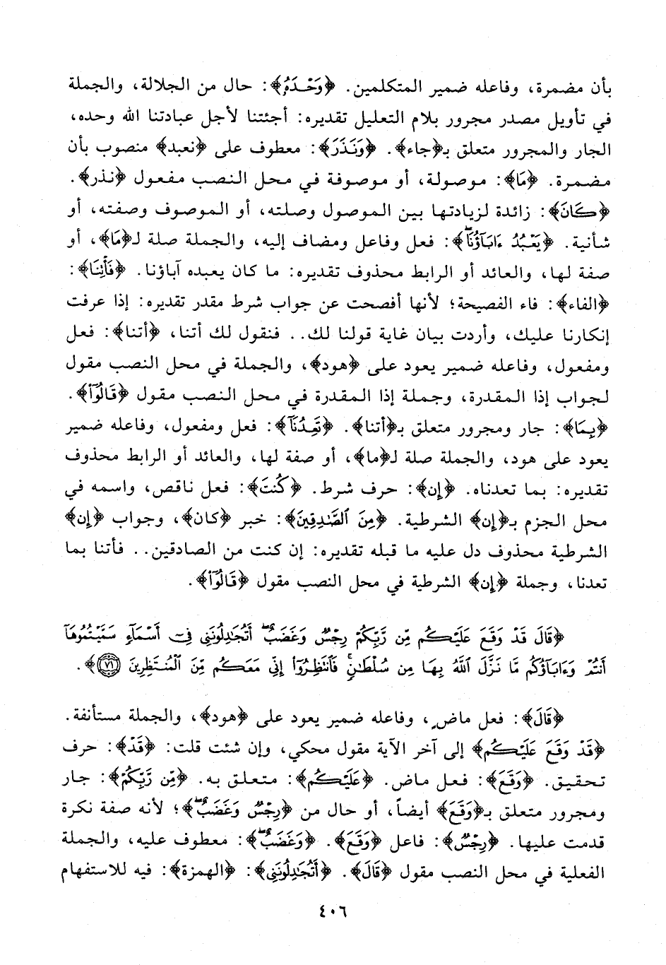 {قالَ}: فعل ماض، وفاعله ضمير يعود على {هود}، والجملة مستأنفة. {قَدْ وَقَعَ عَلَيْكُمْ} إلى آخر الآية مقول محكي، وإن شئت قلت: {قَدْ}: حرف تحقيق. {وَقَعَ}: فعل ماض. {عَلَيْكُمْ}: متعلق به. {مِنْ رَبِّكُمْ}: جار ومجرور متعلق بـ {وَقَعَ} أيضا، أو حال من {رِجْسٌ وَغَضَبٌ}؛ لأنه صفة نكرة قدمت عليها. {رِجْسٌ}: فاعل {وَقَعَ}. {وَغَضَبٌ}: معطوف عليه، والجملة الفعلية في محل النصب مقول {قالَ}. {أَتُجادِلُونَنِي}: {الهمزة}: فيه للاستفهام