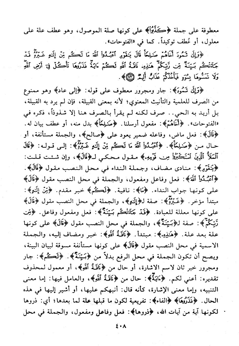 {وَإِلى ثَمُودَ}: جار ومجرور معطوف على قوله: {إِلى عادٍ} وهو ممنوع من الصرف للعلمية والتأنيث المعنوي؛ لأنه بمعنى القبيلة، فإن لم يرد به القبيلة، بل أريد به الحي .. صرف لكنه لم يقرأ بالصرف هنا إلا شذوذا، ذكره في «الفتوحات». {أَخاهُمْ}: مفعول أرسلنا. {صالِحًا} بدل منه، أو عطف بيان له. {قالَ}: فعل ماض، وفاعله ضمير يعود على {صالح}، والجملة مستأنفة، أو حال من {صالِحًا}. {اعْبُدُوا اللَّهَ ما لَكُمْ مِنْ إِلهٍ غَيْرُهُ}: إلى قوله: {قالَ الْمَلَأُ الَّذِينَ اسْتَكْبَرُوا مِنْ قَوْمِهِ} مقول محكي لـ {قالَ}، وإن شئت قلت: {يا قَوْمِ}: منادى مضاف، وجملة النداء في محل النصب مقول {قالَ}. {اعْبُدُوا اللَّهَ}: فعل وفاعل ومفعول، والجملة في محل النصب مقول {قالَ} على كونها جواب النداء. {ما}: نافية. {لَكُمْ} خبر مقدم. {مِنْ إِلهٍ}: مبتدأ مؤخر. {غَيْرُهُ}: صفة لـ {إِلهٍ}، والجملة في محل النصب مقول {قالَ} على كونها معللة للعبادة. {قَدْ جاءَتْكُمْ بَيِّنَةٌ}: فعل ومفعول وفاعل. {مِنْ رَبِّكُمْ}: صفة لـ {بَيِّنَةٌ}، والجملة في محل النصب مقول {قالَ} على كونها علة بعد علة. {هذِهِ}: مبتدأ. {ناقَةُ اللَّهِ}: خبر ومضاف إليه، والجملة الاسمية في محل النصب مقول {قالَ} على كونها مستأنفة مسوقة لبيان البينة، ويصح أن تكون الجملة في محل الرفع بدلا من {بَيِّنَةٌ}. {لَكُمْ}: جار ومجرور خبر ثان لاسم الاشارة، أو حال من {ناقَةُ اللَّهِ}، أو معمول لمحذوف تقديره: أعني لكم. {آيَةً}: حال من {ناقَةُ اللَّهِ}، والعامل فيها: إما معنى التنبيه، وإما معنى الإشارة، كأنه قال: أنبهكم عليها، أو أشير إليها في هذه الحال. {فَذَرُوها} {الفاء}: تفريعية لكون ما قبلها علة لما بعدها؛ أي: ذروها لكونها آية من آيات الله، {ذروها}: فعل وفاعل ومفعول، والجملة في محل
