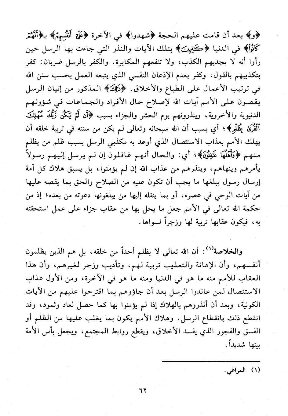 131 - {ذلِكَ} المذكور من إتيان الرسل يقصون على الأمم آيات الله لإصلاح حال الأفراد والجماعات في شؤونهم الدنيوية والأخروية، وينذرونهم يوم الحشر والجزاء بسبب {أَنْ لَمْ يَكُنْ رَبُّكَ مُهْلِكَ الْقُرى بِظُلْمٍ}؛ أي بسبب أن الله سبحانه وتعالى لم يكن من سننه في تربية خلقه أن يهلك الأمم بعذاب الاستئصال الذي أوعد به مكذبي الرسل بسبب ظلم من يظلم منهم {وَأَهْلُها غافِلُونَ}؛ أي: والحال أنهم غافلون إن لم يرسل إليهم رسولا يأمرهم وينهاهم، وينذرهم من عذاب الله إن لم يؤمنوا، بل يسبق هلاك كل أمة إرسال رسول يبلغها ما يجب أن تكون عليه من الصلاح والحق بما يقصه عليها من آيات الوحي في عصره، أو بما ينقله إليها من يبلغونها دعوته من بعده؛ إذ من حكمة الله تعالى في الأمم جعل ما يحل بها من عقاب جزاء على عمل استحقته به، فيكون عقابها تربية لها وزجرا لسواها.