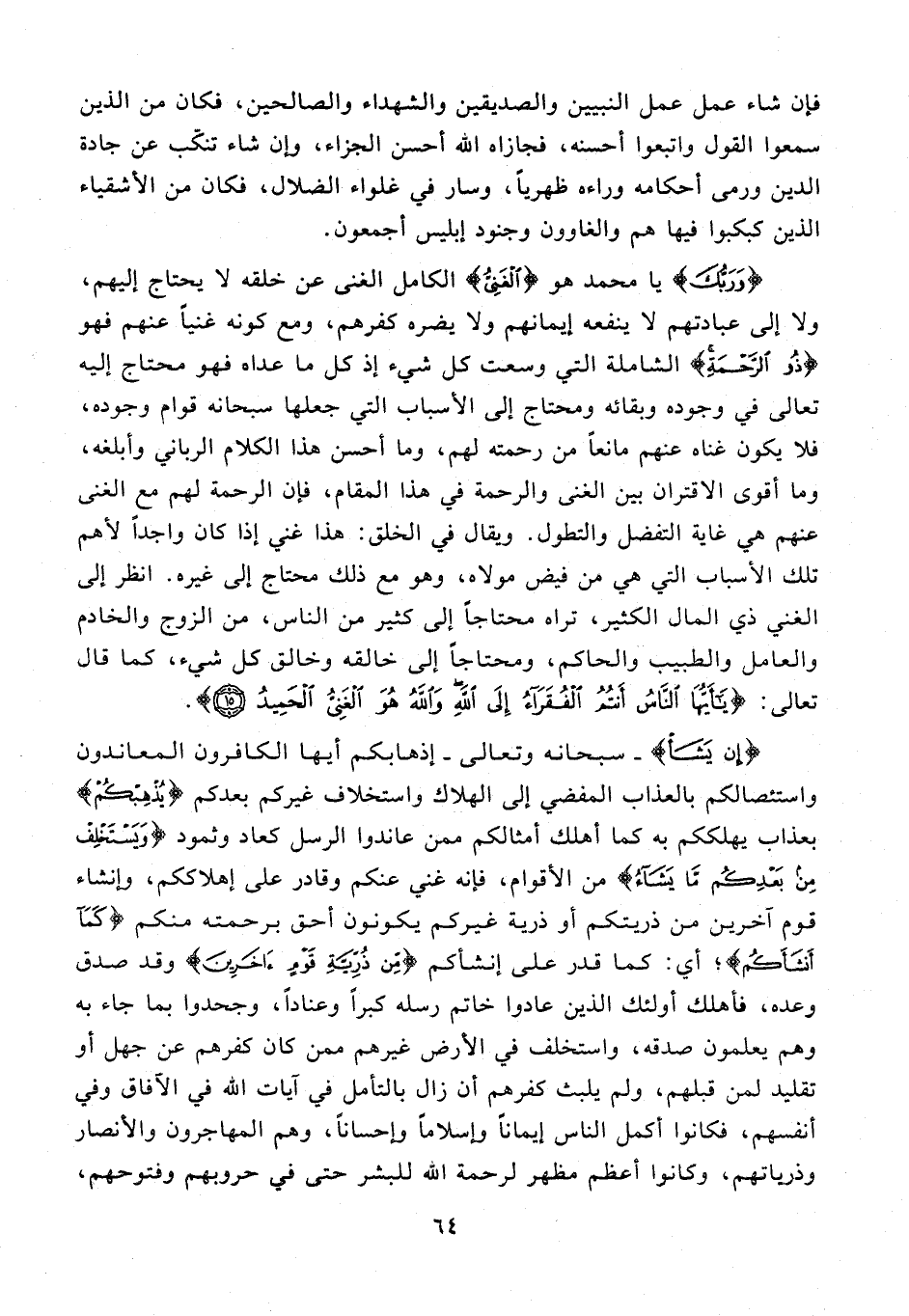 133 - {وَرَبُّكَ} يا محمد هو {الْغَنِيُّ} الكامل الغنى عن خلقه لا يحتاج إليهم، ولا إلى عبادتهم لا ينفعه إيمانهم ولا يضره كفرهم، ومع كونه غنيا عنهم فهو {ذُو الرَّحْمَةِ} الشاملة التي وسعت كل شيء إذ كل ما عداه فهو محتاج إليه تعالى في وجوده وبقائه ومحتاج إلى الأسباب التي جعلها سبحانه قوام وجوده، فلا يكون غناه عنهم مانعا من رحمته لهم، وما أحسن هذا الكلام الرباني وأبلغه، وما أقوى الاقتران بين الغنى والرحمة في هذا المقام، فإن الرحمة لهم مع الغنى عنهم هي غاية التفضل والتطول. ويقال في الخلق: هذا غني إذا كان واجدا لأهم تلك الأسباب التي هي من فيض مولاه، وهو مع ذلك محتاج إلى غيره. انظر إلى الغني ذي المال الكثير، تراه محتاجا إلى كثير من الناس، من الزوج والخادم والعامل والطبيب والحاكم، ومحتاجا إلى خالقه وخالق كل شيء، كما قال تعالى: {يا أَيُّهَا النَّاسُ أَنْتُمُ الْفُقَراءُ إِلَى اللَّهِ وَاللَّهُ هُوَ الْغَنِيُّ الْحَمِيدُ (15)}.
