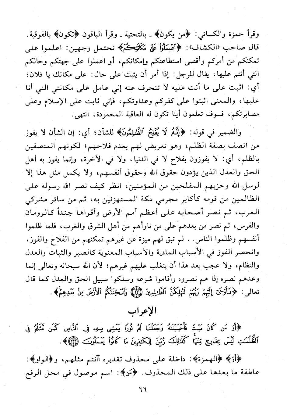 وقرأ حمزة والكسائي: {من يكون} - بالتحتية - وقرأ الباقون {تَكُونُ} بالفوقية. قال صاحب «الكشاف»: {اعْمَلُوا عَلى مَكانَتِكُمْ} تحتمل وجهين: اعلموا على تمكنكم من أمركم وأقصى استطاعتكم وإمكانكم، أو اعملوا على جهتكم وحالكم التي أنتم عليها، يقال للرجل: إذا أمر أن يثبت على حال: على مكانك يا فلان؛ أي: اثبت على ما أنت عليه لا تنحرف عنه إني عامل على مكانتي التي أنا عليها، والمعنى اثبتوا على كفركم وعداوتكم، فإني ثابت على الإسلام وعلى مصابرتكم، فسوف تعلمون أينا تكون له العاقبة المحمودة، انتهى.