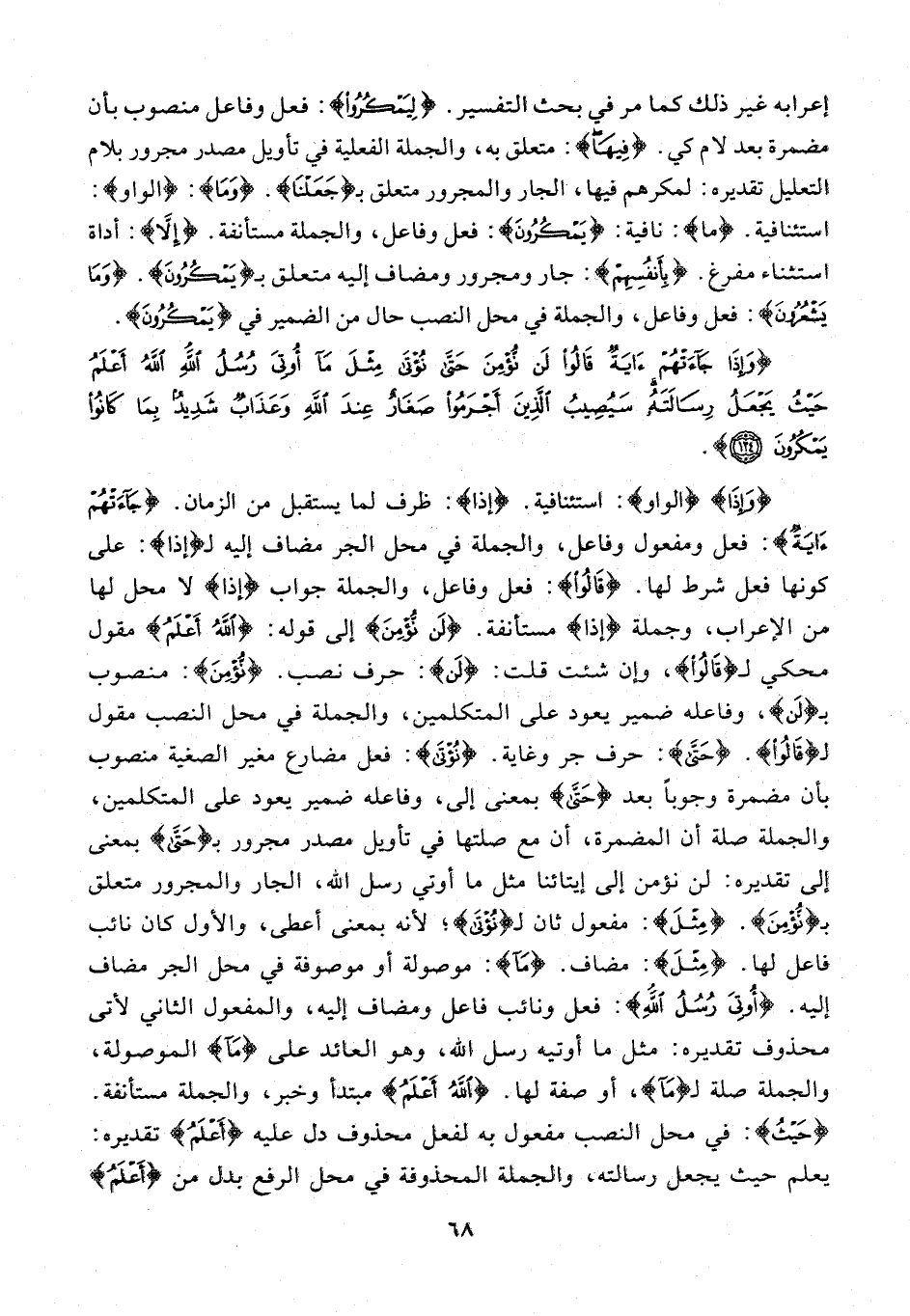 {وَإِذا} {الواو}: استئنافية. {إِذا}: ظرف لما يستقبل من الزمان. {جاءَتْهُمْ آيَةٌ}: فعل ومفعول وفاعل، والجملة في محل الجر مضاف إليه لـ {إِذا}: على كونها فعل شرط لها. {قالُوا}: فعل وفاعل، والجملة جواب {إِذا} لا محل لها من الإعراب، وجملة {إِذا} مستأنفة. {لَنْ نُؤْمِنَ} إلى قوله: {اللَّهُ أَعْلَمُ} مقول محكي لـ {قالُوا}، وإن شئت قلت: {لَنْ}: حرف نصب. {نُؤْمِنَ}: منصوب بـ {لَنْ}، وفاعله ضمير يعود على المتكلمين، والجملة في محل النصب مقول لـ {قالُوا}. {حَتَّى}: حرف جر وغاية. {نُؤْتى}: فعل مضارع مغير الصغية منصوب بأن مضمرة وجوبا بعد {حَتَّى} بمعنى إلى، وفاعله ضمير يعود على المتكلمين، والجملة صلة أن المضمرة، أن مع صلتها في تأويل مصدر مجرور بـ {حَتَّى} بمعنى إلى تقديره: لن نؤمن إلى إيتائنا مثل ما أوتي رسل الله، الجار والمجرور متعلق بـ {نُؤْمِنَ}. مِثْلَ: مفعول ثان لـ {نُؤْتى}؛ لأنه بمعنى أعطى، والأول كان نائب فاعل لها. {مِثْلَ}: مضاف. {ما}: موصولة أو موصوفة في محل الجر مضاف إليه. {أُوتِيَ رُسُلُ اللَّهِ}: فعل ونائب فاعل ومضاف إليه، والمفعول الثاني لأتى محذوف تقديره: مثل ما أوتيه رسل الله، وهو العائد على {ما} الموصولة، والجملة صلة لـ {ما}، أو صفة لها. {اللَّهُ أَعْلَمُ} مبتدأ وخبر، والجملة مستأنفة. {حَيْثُ}: في محل النصب مفعول به لفعل محذوف دل عليه {أَعْلَمُ} تقديره: يعلم حيث يجعل رسالته، والجملة المحذوفة في محل الرفع بدل من {أَعْلَمُ}