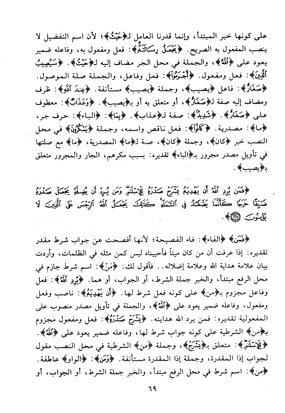 {فَمَنْ} (الفاء): فاء الفصيحة؛ لأنها أفصحت عن جواب شرط مقدر تقديره: إذا عرفت أن من كان ميتا فأحييناه ليس كمن مثله في الظلمات، وأردت بيان علامة هداية الله وعلامة إضلاله .. فأقول لك: {من}: اسم شرط جازم في محل الرفع مبتدأ، والخبر جملة الشرط، أو الجواب، أو هما. {يُرِدِ اللَّهُ}: فعل وفاعل مجزوم بـ {من} على كونه فعل شرط لها. {أَنْ يَهْدِيَهُ}: ناصب وفعل ومفعول، وفاعله ضمير يعود على {اللَّهُ}، والجملة في تأويل مصدر منصوب على المفعولية تقديره: فمن يرد الله هدايته. {يَشْرَحْ صَدْرَهُ}: فعل ومفعول مجزوم بـ (من) الشرطية على كونه جواب شرط لها، وفاعله ضمير يعود على {اللَّهُ}. {لِلْإِسْلامِ}: متعلق بـ {يَشْرَحْ}، وجملة (من) الشرطية في محل النصب مقول لجواب إذا المقدرة، وجملة إذا المقدرة مستأنفة. {وَمَنْ}: {الواو} عاطفة.