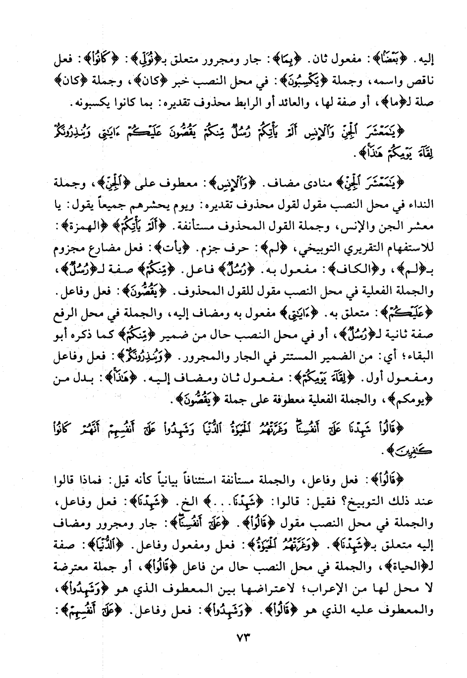 {يا مَعْشَرَ الْجِنِّ} منادى مضاف. {وَالْإِنْسِ}: معطوف على {الْجِنِّ}، وجملة النداء في محل النصب مقول لقول محذوف تقديره: ويوم يحشرهم جميعا يقول: يا مَعْشَرَ الْجِنِّ وَالْإِنْسِ، وجملة القول المحذوف مستأنفة. {أَلَمْ يَأْتِكُمْ} (الهمزة): للاستفهام التقريري التوبيخي، {لَمْ}: حرف جزم. (يأت): فعل مضارع مجزوم بـ لَمْ، و (الكاف): مفعول به. {رُسُلٌ} فاعل. {مِنْكُمْ} صفة لـ {رُسُلٌ}، والجملة الفعلية في محل النصب مقول للقول المحذوف. {يَقُصُّونَ}: فعل وفاعل. {عَلَيْكُمْ}: متعلق به. {آياتِي} مفعول به ومضاف إليه، والجملة في محل الرفع صفة ثانية لـ {رُسُلٌ}، أو في محل النصب حال من ضمير {مِنْكُمْ} كما ذكره أبو البقاء؛ أي: من الضمير المستتر في الجار والمجرور. {وَيُنْذِرُونَكُمْ}: فعل وفاعل ومفعول أول. {لِقاءَ يَوْمِكُمْ}: مفعول ثان ومضاف إليه. {هذا}: بدل من يَوْمِكُمْ، والجملة الفعلية معطوفة على جملة {يَقُصُّونَ}.