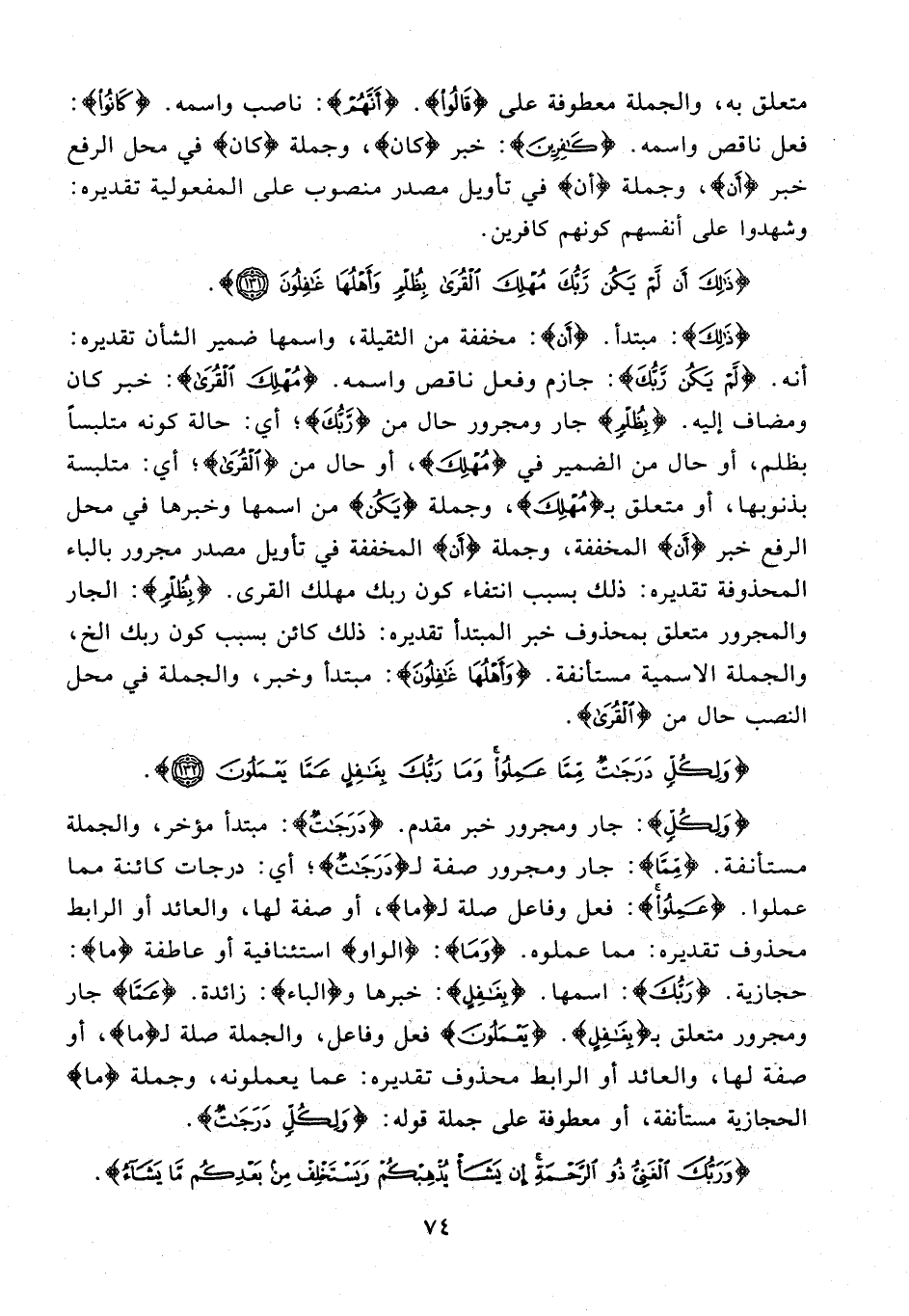 {وَلِكُلٍّ}: جار ومجرور خبر مقدم. {دَرَجاتٌ}: مبتدأ مؤخر، والجملة مستأنفة. {مِمَّا}: جار ومجرور صفة لـ {دَرَجاتٌ}؛ أي: درجات كائنة مما عملوا. {عَمِلُوا}: فعل وفاعل صلة لـ {ما}، أو صفة لها، والعائد أو الرابط محذوف تقديره: مما عملوه. {وَما}: {الواو} استئنافية أو عاطفة {ما}: حجازية. {رَبُّكَ}: اسمها. {بِغافِلٍ}: خبرها و (الباء): زائدة. {عَمَّا} جار ومجرور متعلق بـ {بِغافِلٍ}. {يَعْمَلُونَ} فعل وفاعل، والجملة صلة لـ {ما}، أو صفة لها، والعائد أو الرابط محذوف تقديره: عما يعملونه، وجملة {ما} الحجازية مستأنفة، أو معطوفة على جملة قوله: {وَلِكُلٍّ دَرَجاتٌ}.