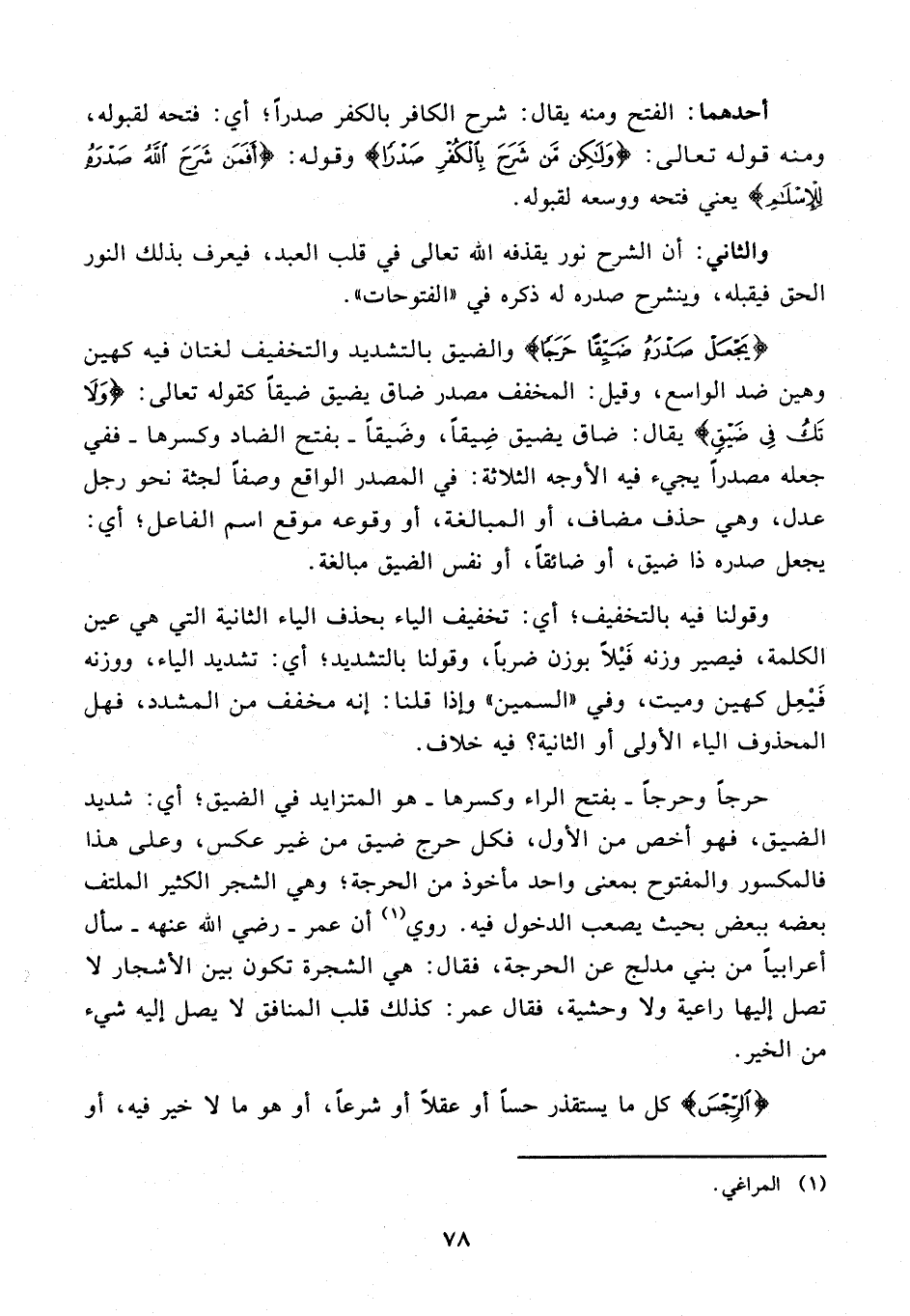 حرجا وحرجا - بفتح الراء وكسرها - هو المتزايد في الضيق؛ أي: شديد الضيق، فهو أخص من الأول، فكل حرج ضيق من غير عكس، وعلى هذا فالمكسور والمفتوح بمعنى واحد مأخوذ من الحرجة؛ وهي الشجر الكثير الملتف بعضه ببعض بحيث يصعب الدخول فيه. روي (¬1) أن عمر - رضي الله عنهه - سأل أعرابيا من بني مدلج عن الحرجة، فقال: هي الشجرة تكون بين الأشجار لا تصل إليها راعية ولا وحشية، فقال عمر: كذلك قلب المنافق لا يصل إليه شيء من الخير.