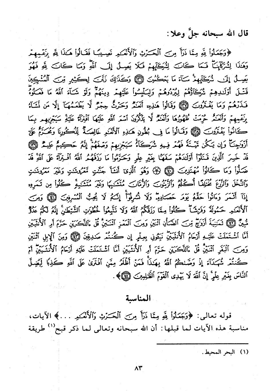 {وَجَعَلُوا لِلَّهِ مِمَّا ذَرَأَ مِنَ الْحَرْثِ وَالْأَنْعامِ نَصِيبًا فَقالُوا هذا لِلَّهِ بِزَعْمِهِمْ وَهذا لِشُرَكائِنا فَما كانَ لِشُرَكائِهِمْ فَلا يَصِلُ إِلَى اللَّهِ وَما كانَ لِلَّهِ فَهُوَ يَصِلُ إِلى شُرَكائِهِمْ ساءَ ما يَحْكُمُونَ (136) وَكَذلِكَ زَيَّنَ لِكَثِيرٍ مِنَ الْمُشْرِكِينَ قَتْلَ أَوْلادِهِمْ شُرَكاؤُهُمْ لِيُرْدُوهُمْ وَلِيَلْبِسُوا عَلَيْهِمْ دِينَهُمْ وَلَوْ شاءَ اللَّهُ ما فَعَلُوهُ فَذَرْهُمْ وَما يَفْتَرُونَ (137) وَقالُوا هذِهِ أَنْعامٌ وَحَرْثٌ حِجْرٌ لا يَطْعَمُها إِلاَّ مَنْ نَشاءُ بِزَعْمِهِمْ وَأَنْعامٌ حُرِّمَتْ ظُهُورُها وَأَنْعامٌ لا يَذْكُرُونَ اسْمَ اللَّهِ عَلَيْهَا افْتِراءً عَلَيْهِ سَيَجْزِيهِمْ بِما كانُوا يَفْتَرُونَ (138) وَقالُوا ما فِي بُطُونِ هذِهِ الْأَنْعامِ خالِصَةٌ لِذُكُورِنا وَمُحَرَّمٌ عَلى أَزْواجِنا وَإِنْ يَكُنْ مَيْتَةً فَهُمْ فِيهِ شُرَكاءُ سَيَجْزِيهِمْ وَصْفَهُمْ إِنَّهُ حَكِيمٌ عَلِيمٌ (139) قَدْ خَسِرَ الَّذِينَ قَتَلُوا أَوْلادَهُمْ سَفَهًا بِغَيْرِ عِلْمٍ وَحَرَّمُوا ما رَزَقَهُمُ اللَّهُ افْتِراءً عَلَى اللَّهِ قَدْ ضَلُّوا وَما كانُوا مُهْتَدِينَ (140) وَهُوَ الَّذِي أَنْشَأَ جَنَّاتٍ مَعْرُوشاتٍ وَغَيْرَ مَعْرُوشاتٍ وَالنَّخْلَ وَالزَّرْعَ مُخْتَلِفًا أُكُلُهُ وَالزَّيْتُونَ وَالرُّمَّانَ مُتَشابِهًا وَغَيْرَ مُتَشابِهٍ كُلُوا مِنْ ثَمَرِهِ إِذا أَثْمَرَ وَآتُوا حَقَّهُ يَوْمَ حَصادِهِ وَلا تُسْرِفُوا إِنَّهُ لا يُحِبُّ الْمُسْرِفِينَ (141) وَمِنَ الْأَنْعامِ حَمُولَةً وَفَرْشًا كُلُوا مِمَّا رَزَقَكُمُ اللَّهُ وَلا تَتَّبِعُوا خُطُواتِ الشَّيْطانِ إِنَّهُ لَكُمْ عَدُوٌّ مُبِينٌ (142) ثَمانِيَةَ أَزْواجٍ مِنَ الضَّأْنِ اثْنَيْنِ وَمِنَ الْمَعْزِ اثْنَيْنِ قُلْ آلذَّكَرَيْنِ حَرَّمَ أَمِ الْأُنْثَيَيْنِ أَمَّا اشْتَمَلَتْ عَلَيْهِ أَرْحامُ الْأُنْثَيَيْنِ نَبِّئُونِي بِعِلْمٍ إِنْ كُنْتُمْ صادِقِينَ (143) وَمِنَ الْإِبِلِ اثْنَيْنِ وَمِنَ الْبَقَرِ اثْنَيْنِ قُلْ آلذَّكَرَيْنِ حَرَّمَ أَمِ الْأُنْثَيَيْنِ أَمَّا اشْتَمَلَتْ عَلَيْهِ أَرْحامُ الْأُنْثَيَيْنِ أَمْ كُنْتُمْ شُهَداءَ إِذْ وَصَّاكُمُ اللَّهُ بِهذا فَمَنْ أَظْلَمُ مِمَّنِ افْتَرى عَلَى اللَّهِ كَذِبًا لِيُضِلَّ النَّاسَ بِغَيْرِ عِلْمٍ إِنَّ اللَّهَ لا يَهْدِي الْقَوْمَ الظَّالِمِينَ (144)}.