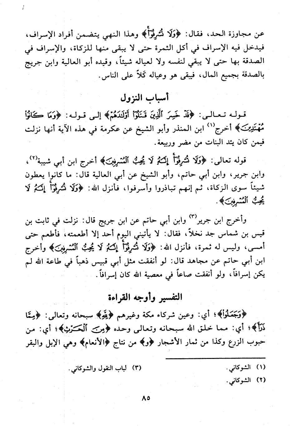 قوله تعالى: {وَلا تُسْرِفُوا إِنَّهُ لا يُحِبُّ الْمُسْرِفِينَ} أخرج ابن أبي شيبة (¬2)، وابن جرير، وابن أبي حاتم، وأبو الشيخ عن أبي العالية قال: ما كانوا يعطون شيئا سوى الزكاة، ثم إنهم تباذروا وأسرفوا، فأنزل الله: {وَلا تُسْرِفُوا إِنَّهُ لا يُحِبُّ الْمُسْرِفِينَ}.