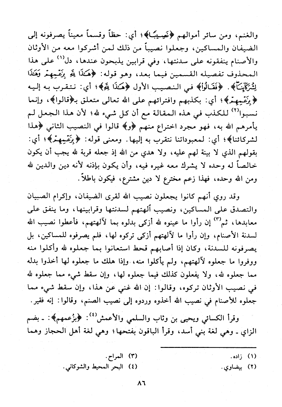 وقد روي أنهم كانوا يجعلون نصيب الله لقرى الضيفان، وإكرام الصبيان والتصدق على المساكين، ونصيب الهتهم لسدنتها وقرابينها، وما ينفق على معابدها، ثم (¬3) إن رأوا ما عينوه لله أزكى بدلوه بما لآلهتهم، فأعطوا نصيب الله لسدنة الأصنام، وإن رأوا ما لآلهتهم أزكى تركوه لها، فلم يصرفوه للمساكين، بل يصرفونه للسدنة، وكان إذا أصابهم قحط استعانوا بما جعلوه لله وأكلوا منه ووفروا ما جعلوه لآلهتهم، ولم يأكلوا منه، وإذا هلك ما جعلوه لها أخذوا بدله مما جعلوه لله، ولا يفعلون كذلك فيما جعلوه لها، وإن سقط شيء مما جعلوه لله في نصيب الأوثان تركوه، وقالوا: إن الله غني عن هذا، وإن سقط شيء مما جعلوه للأصنام في نصيب الله أخذوه وردوه إلى نصيب الصنم، وقالوا: إنه فقير.