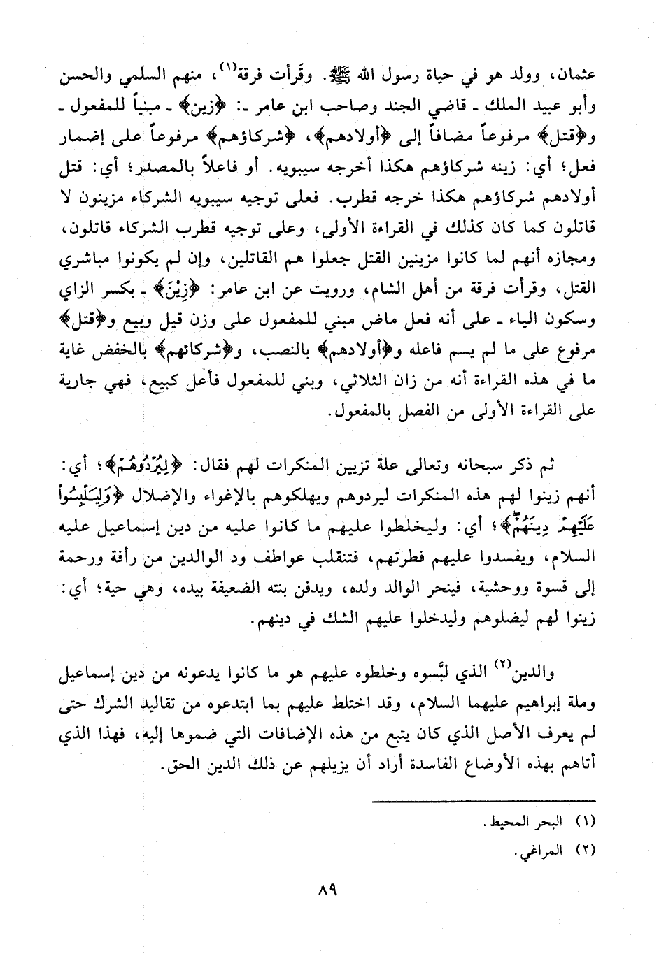عثمان، وولد هو في حياة رسول الله صلى الله عليه وسلم. وقرأت فرقة (¬1)، منهم السلمي والحسن وأبو عبيد الملك - قاضي الجند وصاحب ابن عامر -: {زين} - مبنيا للمفعول - و {قتل} مرفوعا مضافا إلى {أولادهم}، {شُرَكاؤُهُمْ} مرفوعا على إضمار فعل؛ أي: زينه شركاؤهم هكذا أخرجه سيبويه. أو فاعلا بالمصدر؛ أي: قتل أولادهم شركاؤهم هكذا خرجه قطرب. فعلى توجيه سيبويه الشركاء مزينون لا قاتلون كما كان كذلك في القراءة الأولى، وعلى توجيه قطرب الشركاء قاتلون، ومجازه أنهم لما كانوا مزينين القتل جعلوا هم القاتلين، وإن لم يكونوا مباشري القتل، وقرأت فرقة من أهل الشام، ورويت عن ابن عامر: {زين} - بكسر الزاي وسكون الياء - على أنه فعل ماض مبني للمفعول على وزن قيل وبيع و {قتل} مرفوع على ما لم يسم فاعله و {أولادهم} بالنصب، و {شركائهم} بالخفض غاية ما في هذه القراءة أنه من زان الثلاثي، وبني للمفعول فأعل كبيع، فهي جارية على القراءة الأولى من الفصل بالمفعول.