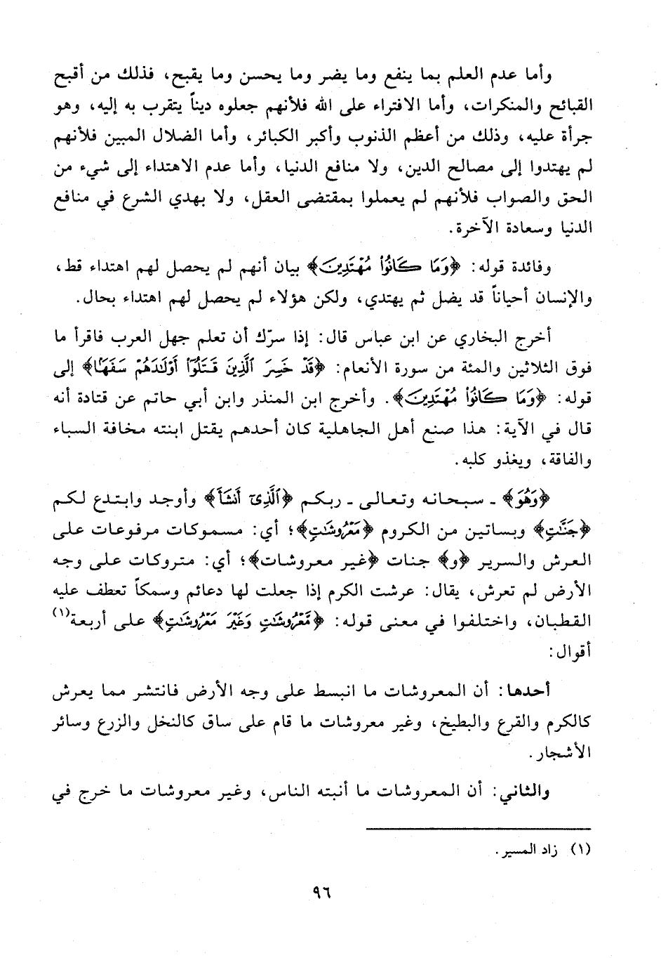 141 - {وَهُوَ} - سبحانه وتعالى - ربكم {الَّذِي أَنْشَأَ} وأوجد وابتدع لكم {جَنَّاتٍ} وبساتين من الكروم {مَعْرُوشاتٍ}؛ أي: مسموكات مرفوعات على العرش والسرير {وَ} جنات {غَيْرَ مَعْرُوشاتٍ}؛ أي: متروكات على وجه الأرض لم تعرش، يقال: عرشت الكرم إذا جعلت لها دعائم وسمكا تعطف عليه القطبان، واختلفوا في معنى قوله: {مَعْرُوشاتٍ وَغَيْرَ مَعْرُوشاتٍ} على أربعة (¬1) أقوال: