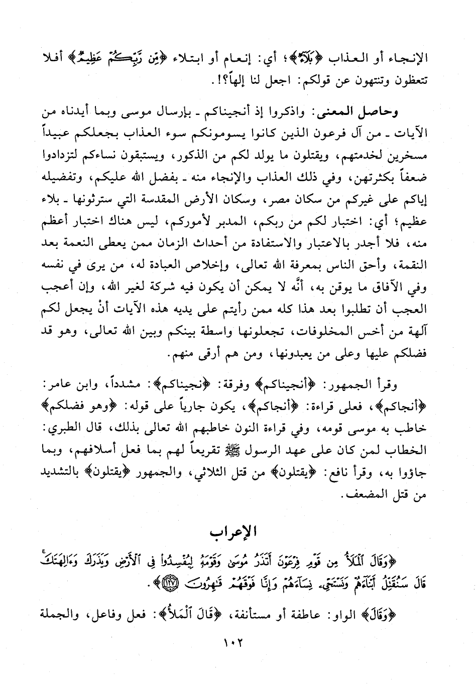 وقرأ الجمهور: {أَنْجَيْناكُمْ} وفرقة: {نجيناكم}: مشددا، وابن عامر: {أنجاكم}، فعلى قراءة: {أنجاكم}، يكون جاريا على قوله: {وَهُوَ فَضَّلَكُمْ} خاطب به موسى قومه، وفي قراءة النون خاطبهم الله تعالى بذلك، قال الطبري: الخطاب لمن كان على عهد الرسول صلى الله عليه وسلّم تقريعا لهم بما فعل أسلافهم، وبما جاؤوا به، وقرأ نافع: {يقتلون} من قتل الثلاثي، والجمهور {يُقَتِّلُونَ} بالتشديد من قتل المضعف.