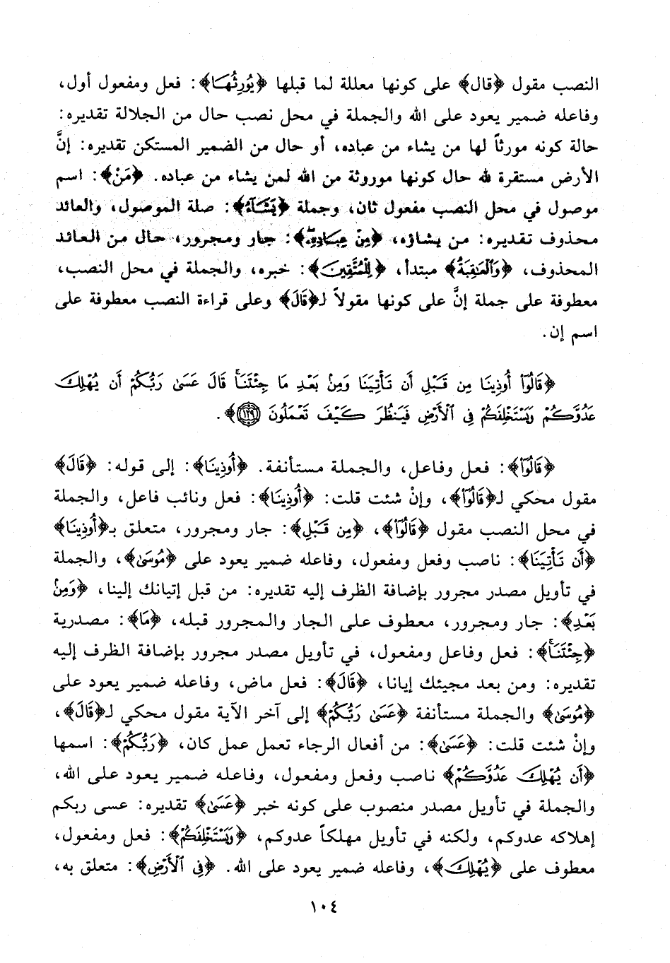 {قالُوا}: فعل وفاعل، والجملة مستأنفة. {أُوذِينا}: إلى قوله: {قالَ} مقول محكي لـ {قالُوا}، وإن شئت قلت: {أُوذِينا}: فعل ونائب فاعل، والجملة في محل النصب مقول {قالُوا}، {مِنْ قَبْلِ}: جار ومجرور، متعلق بـ {أُوذِينا} {أَنْ تَأْتِيَنا}: ناصب وفعل ومفعول، وفاعله ضمير يعود على {مُوسى}، والجملة في تأويل مصدر مجرور بإضافة الظرف إليه تقديره: من قبل إتيانك إلينا، {وَمِنْ بَعْدِ}: جار ومجرور، معطوف على الجار والمجرور قبله، {ما}: مصدرية {جِئْتَنا}: فعل وفاعل ومفعول، في تأويل مصدر مجرور بإضافة الظرف إليه تقديره: ومن بعد مجيئك إيانا، {قالَ}: فعل ماض، وفاعله ضمير يعود على {مُوسى} والجملة مستأنفة {عَسى رَبُّكُمْ} إلى آخر الآية مقول محكي لـ {قالَ}، وإن شئت قلت: {عَسى}: من أفعال الرجاء تعمل عمل كان، {رَبُّكُمْ}: اسمها {أَنْ يُهْلِكَ عَدُوَّكُمْ} ناصب وفعل ومفعول، وفاعله ضمير يعود على الله، والجملة في تأويل مصدر منصوب على كونه خبر {عَسى} تقديره: عسى ربكم إهلاكه عدوكم، ولكنه في تأويل مهلكا عدوكم، {وَيَسْتَخْلِفَكُمْ}: فعل ومفعول، معطوف على {يُهْلِكَ}، وفاعله ضمير يعود على الله. {فِي الْأَرْضِ}: متعلق به،