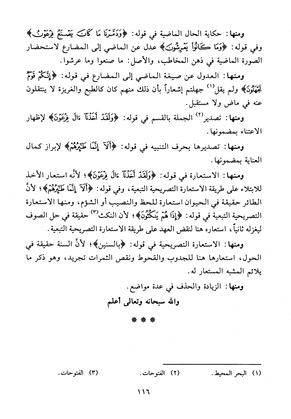 ومنها: الاستعارة في قوله: {وَلَقَدْ أَخَذْنا آلَ فِرْعَوْنَ}؛ لأنّه استعار الأخذ للابتلاء على طريقة الاستعارة التصريحية التبعية، وفي قوله: {أَلا إِنَّما طائِرُهُمْ}؛ لأنّ الطائر حقيقة في الحيوان استعارة للحظ والنصيب أو الشؤم، ومنها الاستعارة التصريحية التبعية في قوله: {إِذا هُمْ يَنْكُثُونَ}؛ لأن النكث (¬3) حقيقة في حل الصوف ليغزله ثانيا، استعاره هنا لنقض العهد على طريقة الاستعارة التصريحية التبعية.
