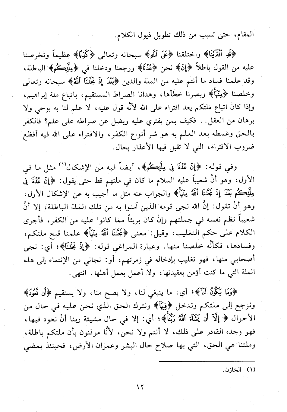 وفي قوله: {إِنْ عُدْنا فِي مِلَّتِكُمْ}، أيضا فيه من الإشكال (¬1) مثل ما في الأول، وهو أنّ شعيبا عليه السلام ما كان في ملتهم قط حتى يقول: {إِنْ عُدْنا فِي مِلَّتِكُمْ بَعْدَ إِذْ نَجَّانَا اللَّهُ مِنْها} والجواب عنه مثل ما أجيب به عن الإشكال الأول، وهو أن تقول: إنّ الله نجى قومه الذين آمنوا به من تلك الملة الباطلة، إلا أنّ شعيبا نظم نفسه في جملتهم وإن كان بريئا مما كانوا عليه من الكفر، فأجرى الكلام على حكم التغليب، وقيل: معنى {نَجَّانَا اللَّهُ مِنْها} علمنا قبح ملتكم، وفسادها، فكأنّه خلصنا منها. وعبارة المراغي قوله: {إِذْ نَجَّانَا}؛ أي: نجى أصحابي منها، فهو تغليب بإدخاله في زمرتهم، أو: نجاني من الإنتماء إلى هذه الملة التي ما كنت أؤمن بعقيدتها، ولا أعمل بعمل أهلها. انتهى.