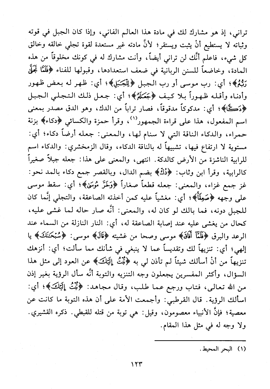 تراني، إذ هو مشارك لك في مادة هذا العالم الفاني، وإذا كان الجبل في قوته وثباته لا يستطيع أن يثبت ويستقر؛ لأنّ مادته غير مستعدة لقوة تجلي خالقه وخالق كل شيء، فاعلم أنّك لن تراني أيضا، وأنت مشارك له في كونك مخلوقا من هذه المادة، وخاضعا للسنن الربانية في ضعف استعدادها، وقبولها للفناء {فَلَمَّا تَجَلَّى رَبُّهُ}؛ أي: رب موسى أو رب الجبل {لِلْجَبَلِ}؛ أي: ظهر له بعض ظهور وأدناه وأقله ظهورا بلا كيف {جَعَلَهُ}؛ أي: جعل ذلك التجلي الجبل {دَكًّا}؛ أي: مدكوكا مدقوقا، فصار ترابا من الدك، وهو الدق مصدر بمعنى اسم المفعول، هذا على قراءة الجمهور (¬1)، وقرأ حمزة والكسائي {دكاء} بزنة حمراء، والدكاء الناقة التي لا سنام لها، والمعنى: جعله أرضا دكاء؛ أي: مستوية لا ارتفاع فيها، تشبيها له بالناقة الدكاء، وقال الزمخشري: والدكاء اسم للرابية الناشزة من الأرض كالدكة. انتهى، والمعنى على هذا: جعله جبلا صغيرا كالرابية، وقرأ ابن وثاب: {دك} بضم الدال، وبالقصر جمع دكاء بالمد نحو: غز جمع غزاء، والمعنى: جعله قطعا صغارا {وَخَرَّ مُوسى}؛ أي: سقط موسى على وجهه {صَعِقًا}؛ أي: مغشيا عليه كمن أخذته الصاعقة، والتجلي إنّما كان للجبل دونه، فما بالك لو كان له، والمعنى: أنّه صار حاله لما غشى عليه، كحال من يغشى عليه عند إصابة الصاعقة له، أي: النار النازلة من السماء عند الرعد والبرق {فَلَمَّا أَفاقَ} موسى وصحا من غشيته {قالَ} موسى: {سُبْحانَكَ} يا إلهي؛ أي: تنزيها لك وتقديسا عما لا ينبغي في شأنك مما سألت؛ أي: أنزهك تنزيها من أن أسألك شيئا لم تأذن لي به {تُبْتُ إِلَيْكَ} عن العود إلى مثل هذا السؤال، وأكثر المفسرين يجعلون وجه التنزيه والتوبة أنّه سأل الرؤية بغير إذن من الله تعالى، فتاب ورجع عما طلب، وقال مجاهد: {تُبْتُ إِلَيْكَ}؛ أي: اسألك الرؤية. قال القرطبي: وأجمعت الأمة على أن هذه التوبة ما كانت عن معصية؛ فإنّ الأنبياء معصومون، وقيل: هي توبة من قتله للقبطي. ذكره القشيري.