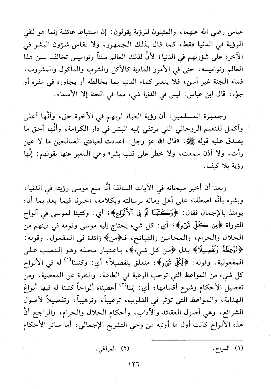 عباس رضي الله عنهما، والمثبتون للرؤية يقولون: إن استنباط عائشة إنما هو لنفي الرؤية في الدنيا فقط، كما قال بذلك الجمهور، ولا تقاس شؤون البشر في الآخرة على شؤونهم في الدنيا؛ لأنّ لذلك العالم سننا ونواميس تخالف سنن هذا العالم ونواميسه، حتى في الأمور المادية كالأكل والشرب والمأكول والمشروب، فماء الجنة غير آسن، فلا يتغير كماء الدنيا بما يخالطه أو يجاوره في مقره أو جوّه، قال ابن عباس: ليس في الدنيا شيء مما في الجنة إلا الأسماء.
