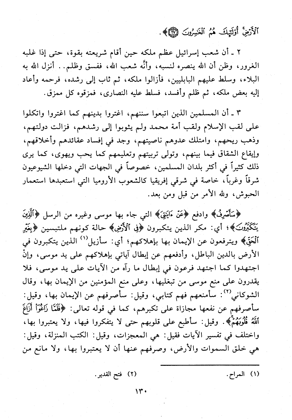146 - {سَأَصْرِفُ} وادفع {عَنْ آياتِيَ} التي جاء بها موسى وغيره من الرسل {الَّذِينَ يَتَكَبَّرُونَ}؛ أي: مكر الذين يتكبرون {فِي الْأَرْضِ} حالة كونهم ملتبسين {بِغَيْرِ الْحَقِّ} ويترفعون عن الإيمان بها بإهلاكهم؛ أي: سأزيل (¬1) الذين يتكبرون في الأرض بالدين الباطل، وأدفعهم عن إبطال آياتي بإهلاكهم على يد موسى، وإن اجتهدوا كما اجتهد فرعون في إبطال ما رآه من الآيات على يد موسى، فلا يقدرون على منع موسى من تبغليها، وعلى منع المؤمنين من الإيمان بها، وقال الشوكاني (¬2): سأمنعهم فهم كتابي، وقيل: سأصرفهم عن الإيمان بها، وقيل: سأصرفهم عن نفعها مجازاة على تكبرهم، كما في قوله تعالى: {فَلَمَّا زاغُوا أَزاغَ اللَّهُ قُلُوبَهُمْ}. وقيل: سأطبع على قلوبهم حتى لا يتفكروا فيها، ولا يعتبروا بها، واختلف في تفسير الآيات فقيل: هي المعجزات، وقيل: الكتب المنزلة، وقيل: