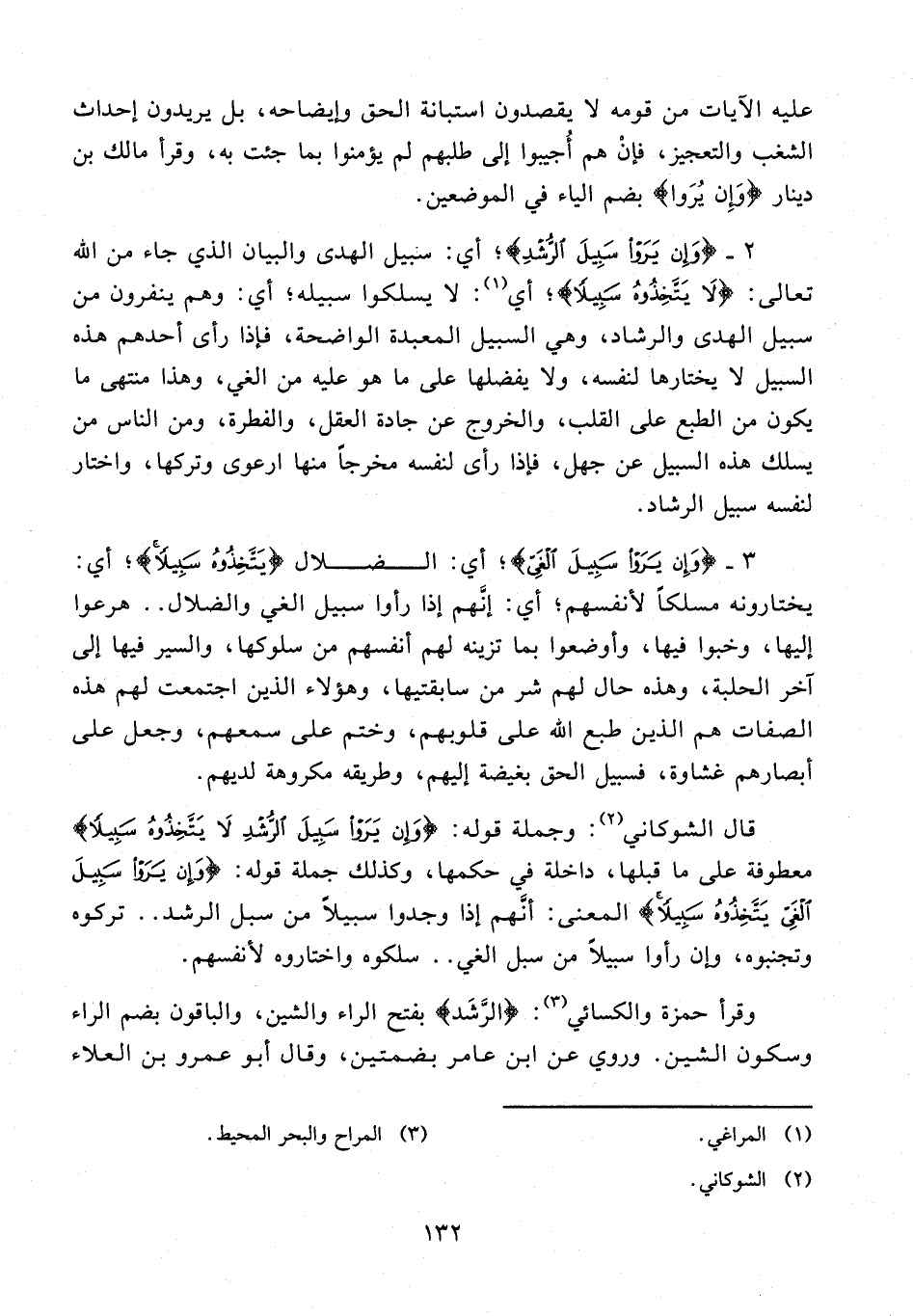 قال الشوكاني (¬2): وجملة قوله: {وَإِنْ يَرَوْا سَبِيلَ الرُّشْدِ لا يَتَّخِذُوهُ سَبِيلًا} معطوفة على ما قبلها، داخلة في حكمها، وكذلك جملة قوله: {وَإِنْ يَرَوْا سَبِيلَ الغَيِّ يَتَّخِذُوهُ سَبِيلًا} المعنى: أنّهم إذا وجدوا سبيلا من سبل الرشد .. تركوه وتجنبوه، وإن رأوا سبيلا من سبل الغي .. سلكوه واختاروه لأنفسهم.