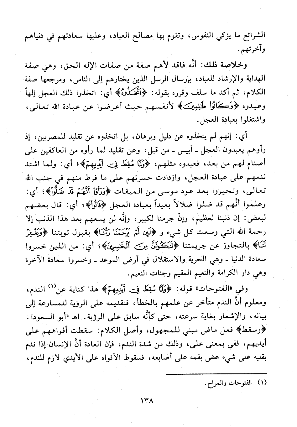 149 - وفي «الفتوحات» قوله: {وَلَمَّا سُقِطَ فِي أَيْدِيهِمْ} هذا كناية عن (¬1) الندم، ومعلوم أنّ الندم متأخر عن علمهم بالخطأ، فتقديمه على الرؤية للمسارعة إلى بيانه، والإشعار بغاية سرعته، حتى كأنّه سابق على الرؤية. اه «أبو السعود».